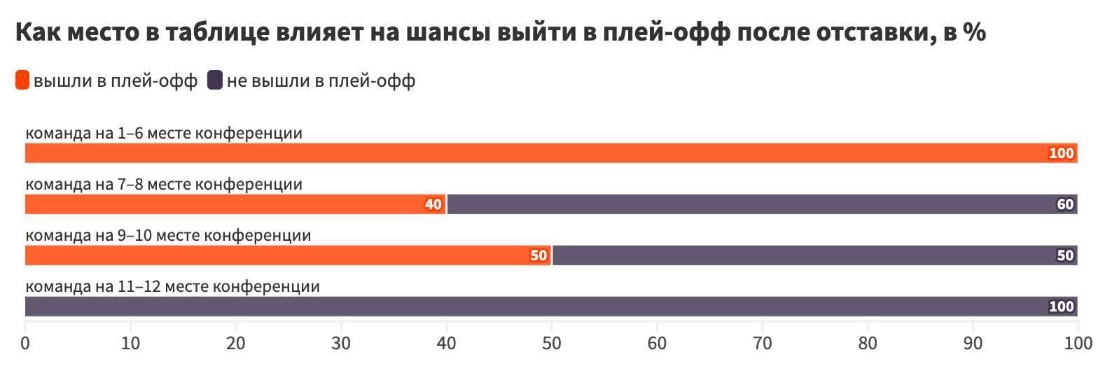 То есть у отставки есть смысл, пока команда ещё в зоне 7–10 мест (40–50% попаданий в плей-офф). Последнее или предпоследнее место в конференции — уже приговор.