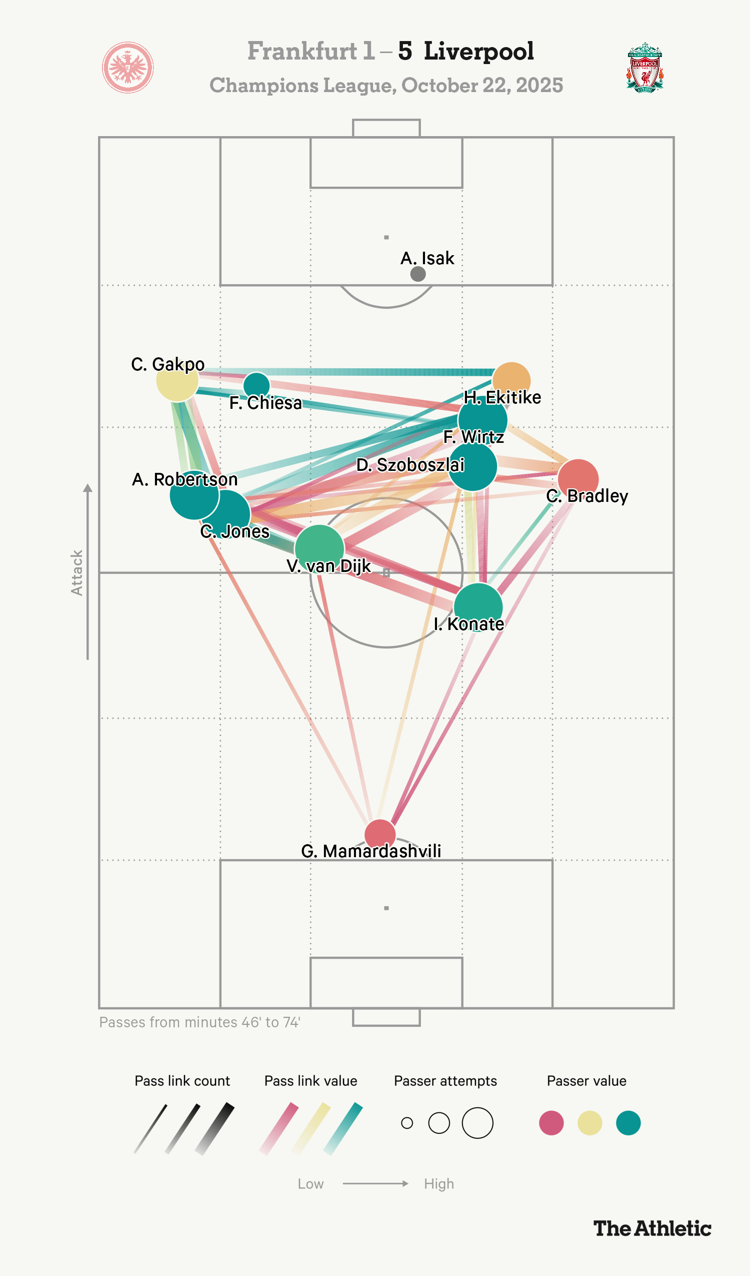 За исключением Кубка Лиги, это была третья игра, в которой Салах не участвовал в этом сезоне, и в каждом случае Слот использовал разные схемы. В матче с «Галатасараем» схема осталась прежней: Фримпонг заменил Салаха, но после победы во Франкфурте со счетом 5:1 Виртц сыграл на правом фланге при счете 4:4:2, а Исак и Юго Экитике впервые вышли вперед вместе.