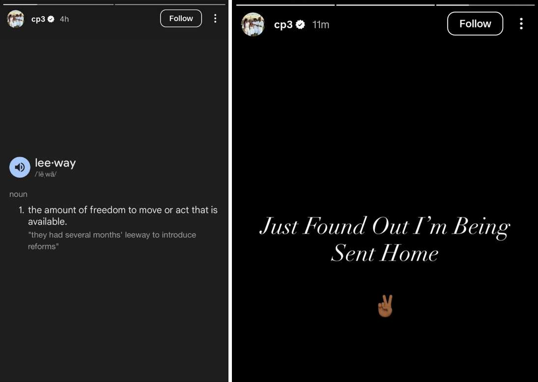 Три дня назад Крис выложил странный пост в соцсетях со словом «leeway» – «свобода действий». Пока все пытались расшифровать и подобрать смыслы, у «Клипперс» случилась еще пара болезненных поражений. И во время выезда на игру в Атланту пришел новый короткий пост Криса в соцсетях на черном фоне – в 3 часа ночи по местному времени: «Только что узнал, что меня отправляют домой».