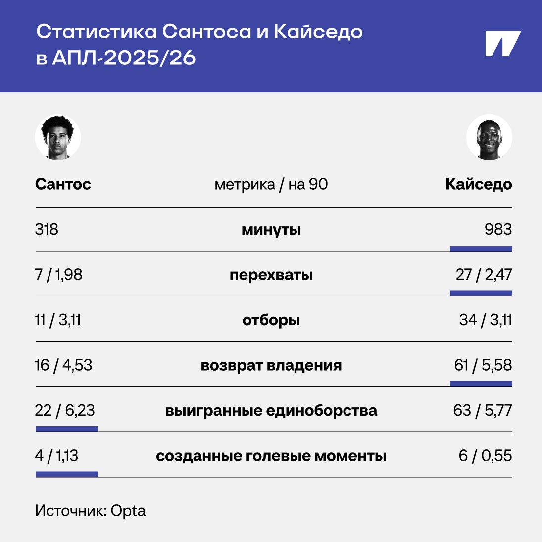 Учитывая то, что говорил Энцо раньше, выглядит как лукавство тренера: всего несколько месяцев назад в Андрея-опорника он не верил. Но цифры показывают, что Сантос готов достойно подменить Кайседо. Даже несмотря на то, что бразилец играет выше, оборонительные метрики близки или даже превосходят Мойсеса: например, Сантос чаще выигрывает единоборства и не хуже отбирает мяч в целом.