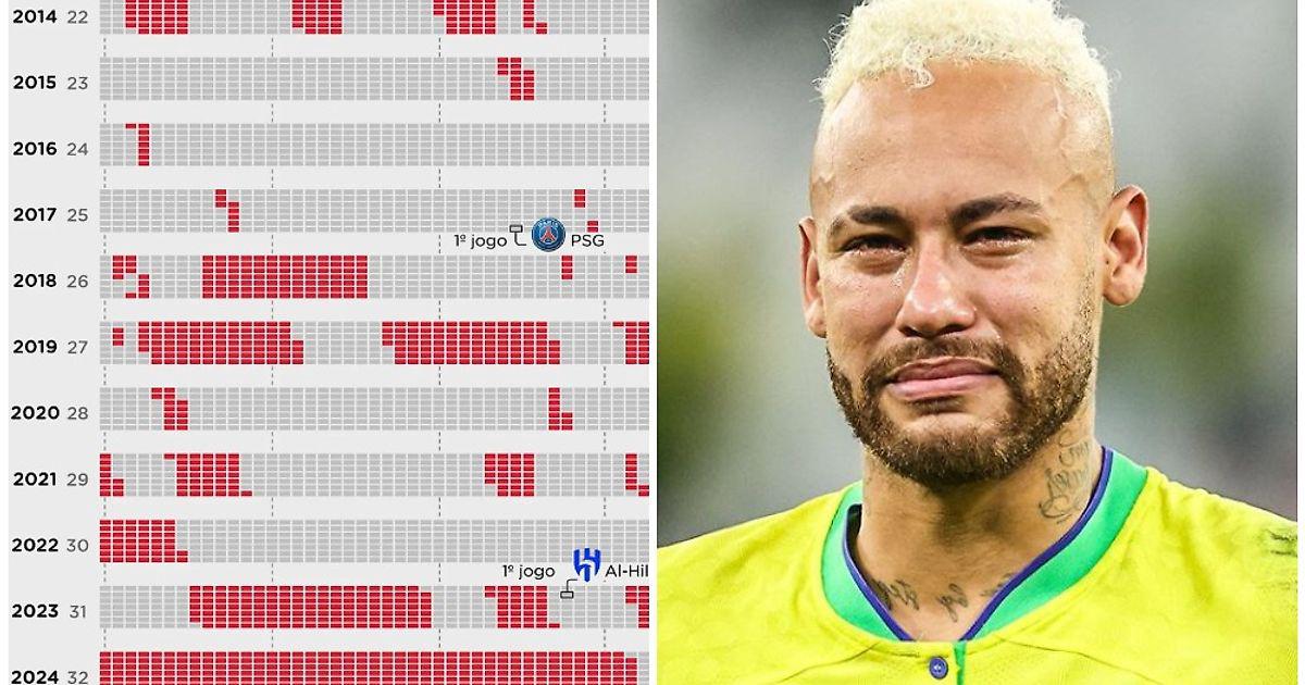 По подсчетам Transfermarkt, за всю карьеру Неймар пропустил более 1000 дней. Волна травм началась в 2014-м, когда футболист выступал за «Барселону».