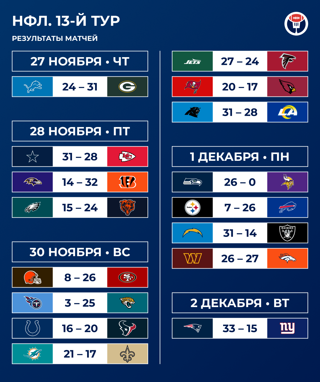 Во всех трех матчах на День благодарения победили андердоги. «Чикаго» обыграл действующих чемпионов Супербоула в два владения, вынудив главного тренера Бена Джонсона бегать по раздевалке с голым торсом. На Юге АФК интрига еще в октябре лежала в реанимации, а сейчас «Хьюстон» победил «Индианаполис» для того, чтобы на первую строчку взгромоздился «Джексонвилл». «Канзас-Сити» опять вернулся к нулевому балансу побед и поражений — нет уверенности, что у команды Энди Рида осталось право на еще одну осечку. Даже «Рэмс» — последняя команда, в чьей силе и стабильности не было сомнений — сенсационно уступили «Каролине».