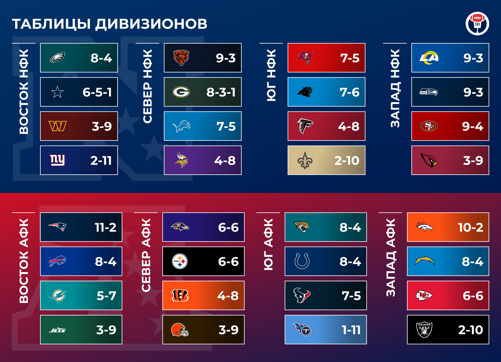 Только представьте: июль 2025 года, вы гуляете по набережной и лениво поглядываете хайлайты из тренировочных лагерей. Вдруг замечаете, как к вам быстро приближаюсь я с вытаращенными глазами. Я хватаю вас за руку и тараторю как безумный: «Я из будущего, запомни и сделай себе на этом деньги — к декабрю Американскую конференцию будет возглавлять «Нью-Ингленд», а Национальную — «Чикаго».