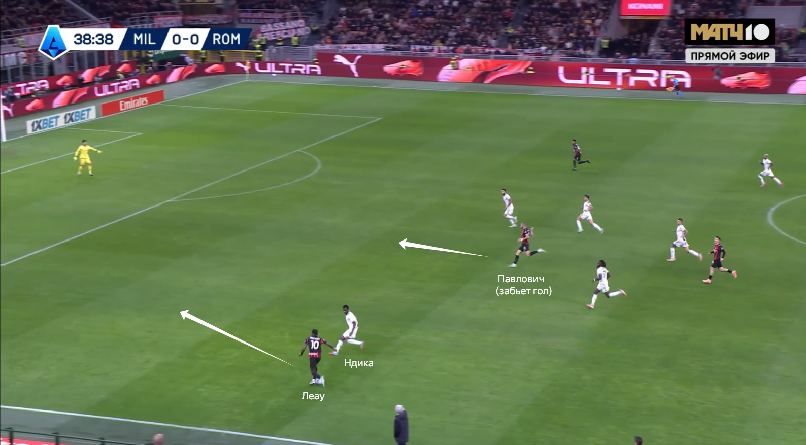Потеря мяча на правом фланге атаки. Сверхзвуковая атака миланцев – итог вялого контрпрессинга римлян. Леау на гектаре пространства разобрался один в один против Ндика и наградил Павловича за его длинный рейд в штрафную голевой передачей.