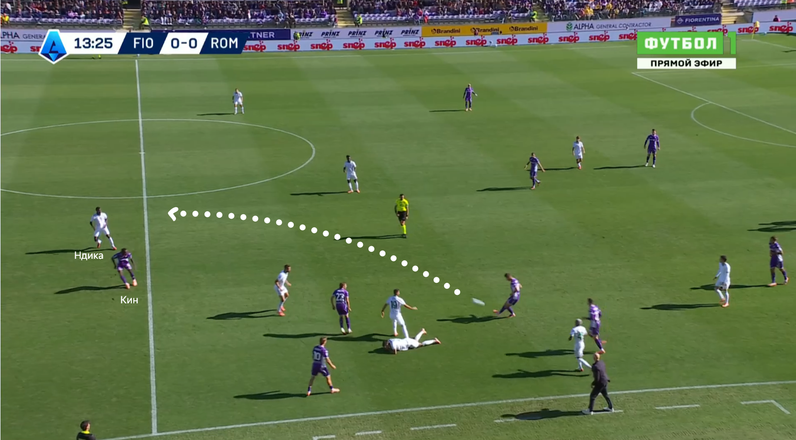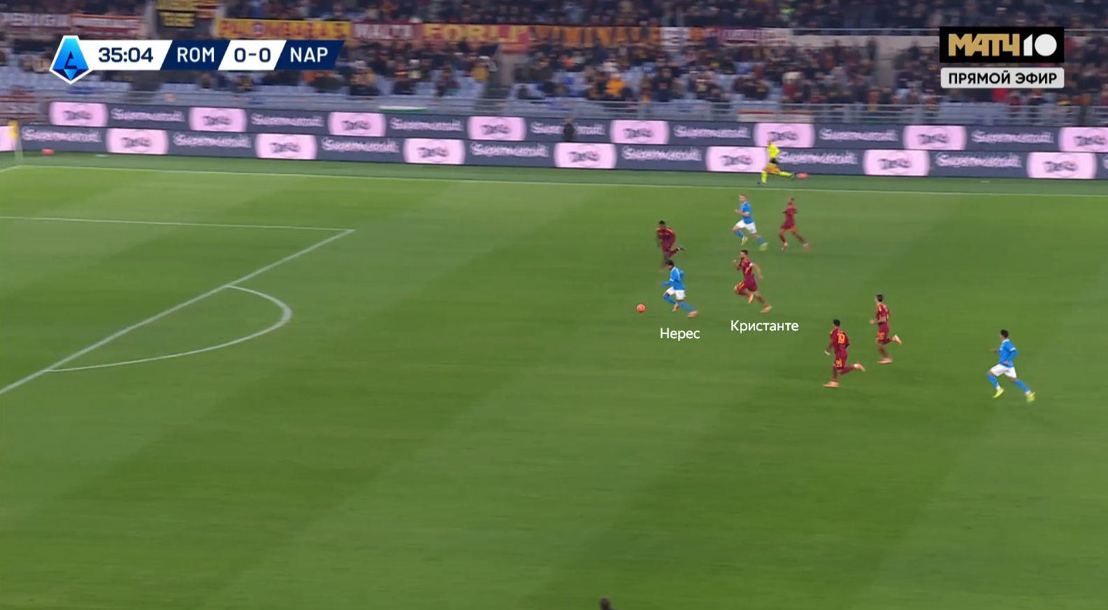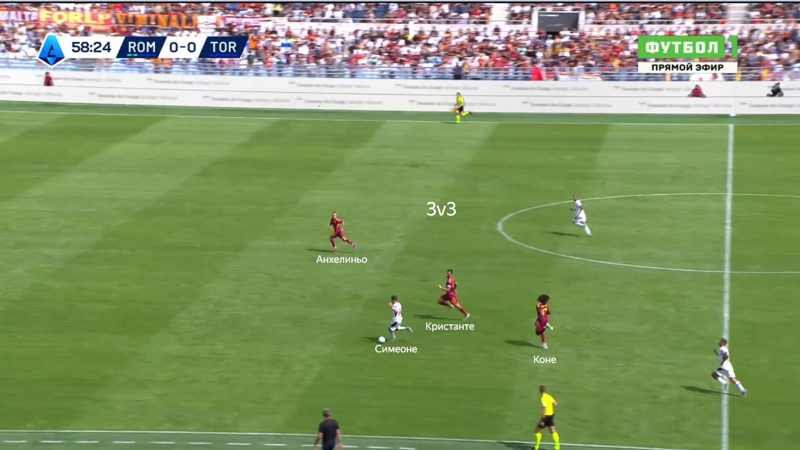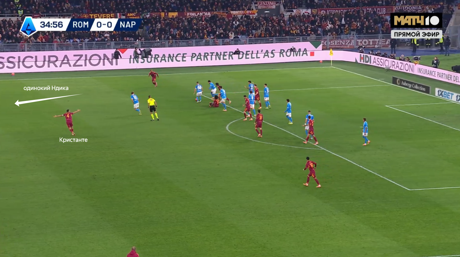 Игра против прямого конкурента. Счет 0:0. Атака римлян. В момент потери мяча перед чужой штрафной, внутри нее находится сразу два римских ЦЗ (Эрмосо и Манчини). Суммарно на границах штрафной 8 игроков «Ромы», Кристанте в подборе и где-то за кадром свою половину сторожит одинокий Ндика.