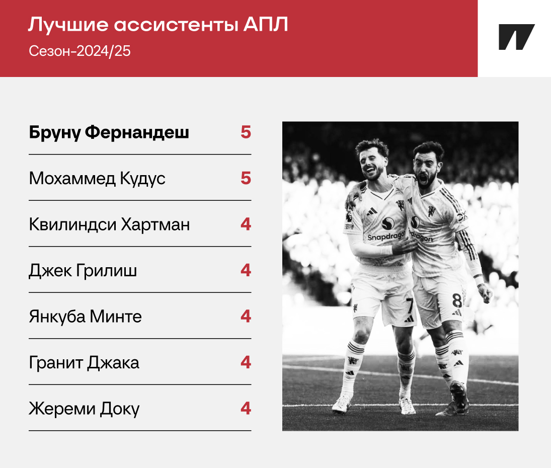 Разброс удивляет: до начала этого сезона у Бруну набралось всего 5 голевых передач со стандартов (из 51 ассиста). За 13 туров АПЛ-2025/26 выбил столько же и вышел на четвертое место в списке лучших ассистентов «МЮ» в эпоху АПЛ.