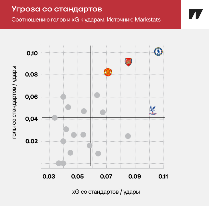 Скачок «МЮ» не только количественный, но и качественный. «МЮ» в тройке лучших клубов АПЛ по соотношению голов и xG со стандартов к ударам.