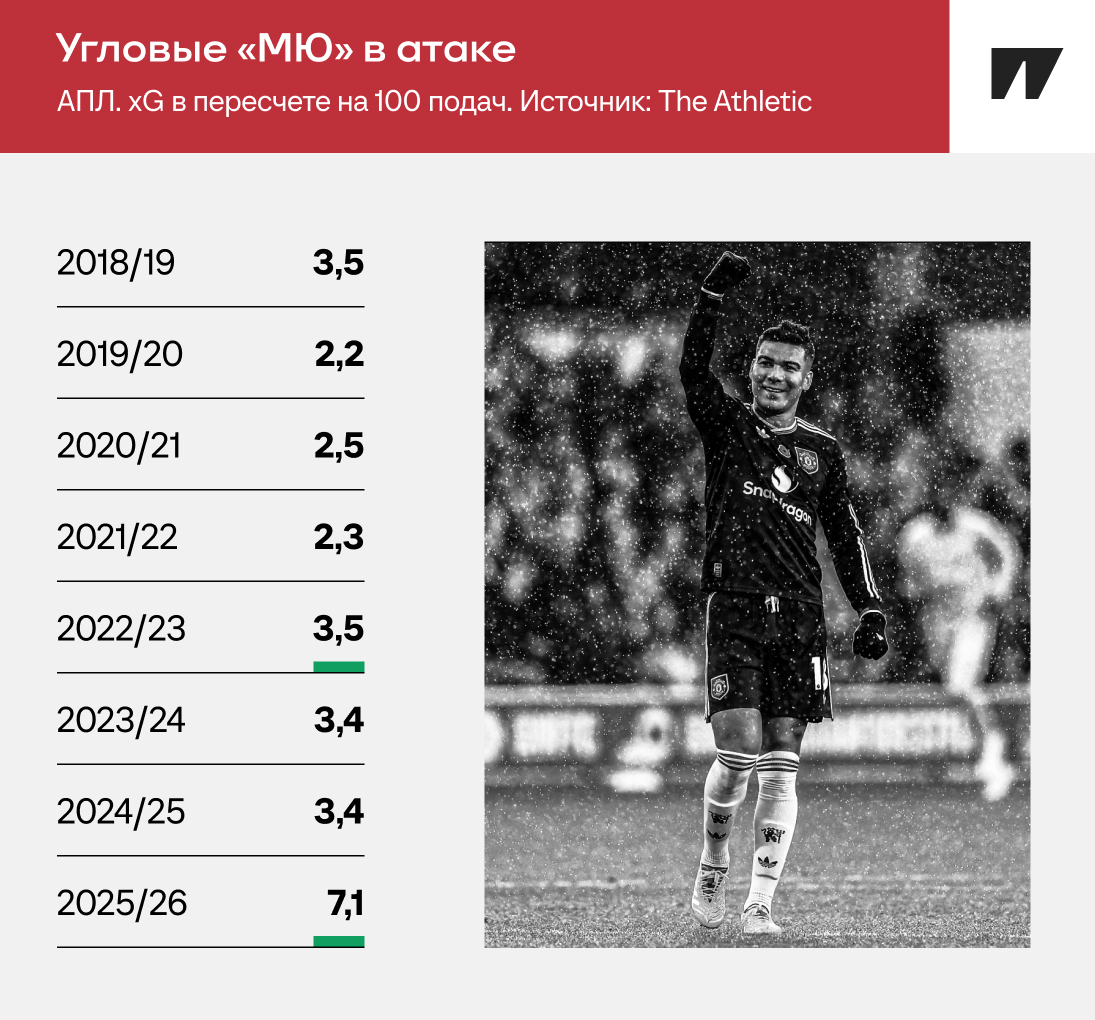 За стандарты в «МЮ» отвечает Карлос Фернандеш – ассистент Аморима, который работает с ним уже семь лет. The Athletic зафиксировал прогресс: в сезоне-2025/26 «МЮ» стал в два раза опаснее предыдущей лучшей версии команды на угловых.