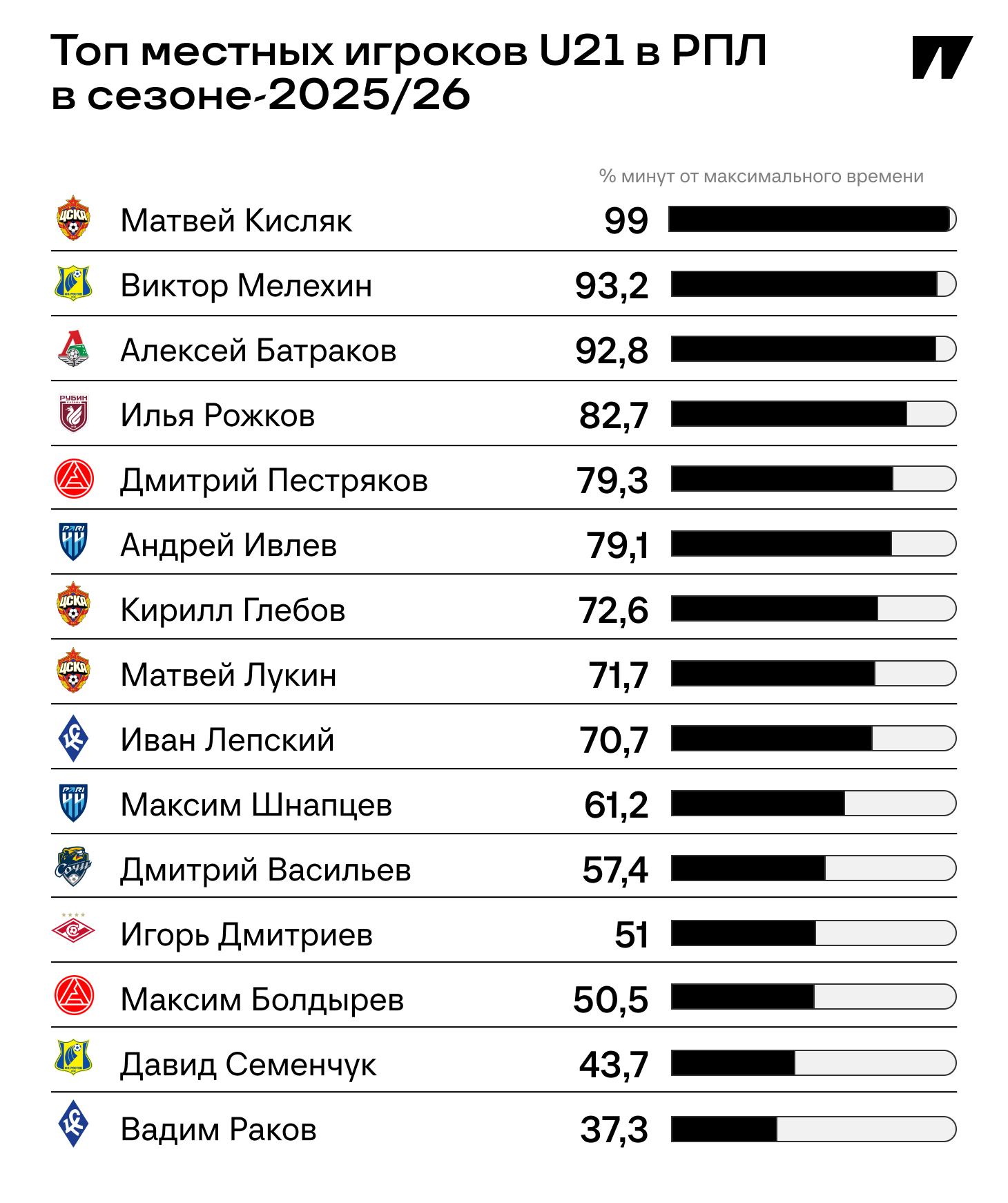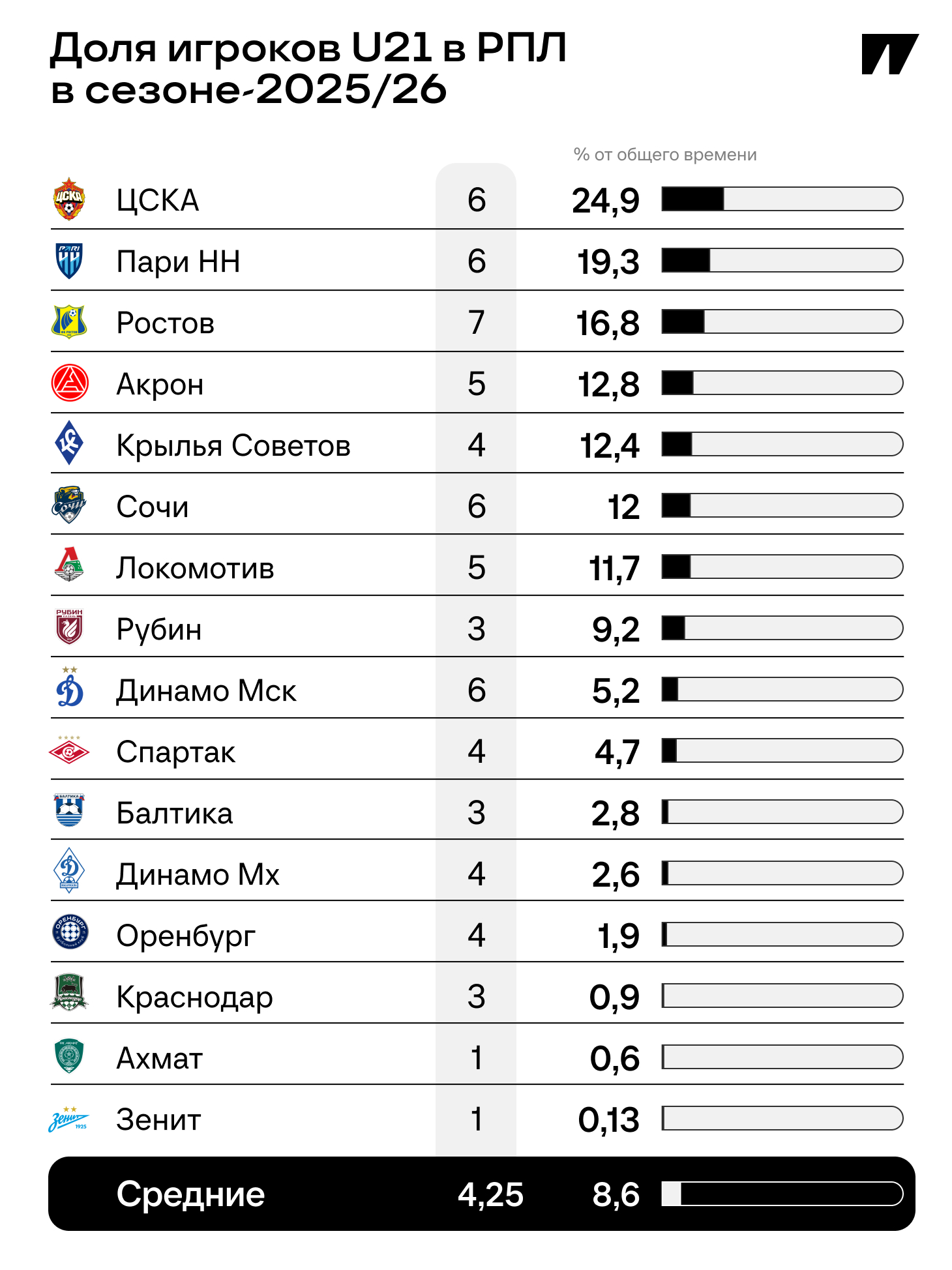 Это соответствует общему тренду РПЛ. Среднее количество игроков U21 на матч сейчас – 4,25, а если брать календарный год, то 3,9. То есть с лета клубы чаще включают в составы молодых, процент задействования вырос еще больше – и сейчас составляет 8,6% от доступного времени (показатель за год – 5,8 %).