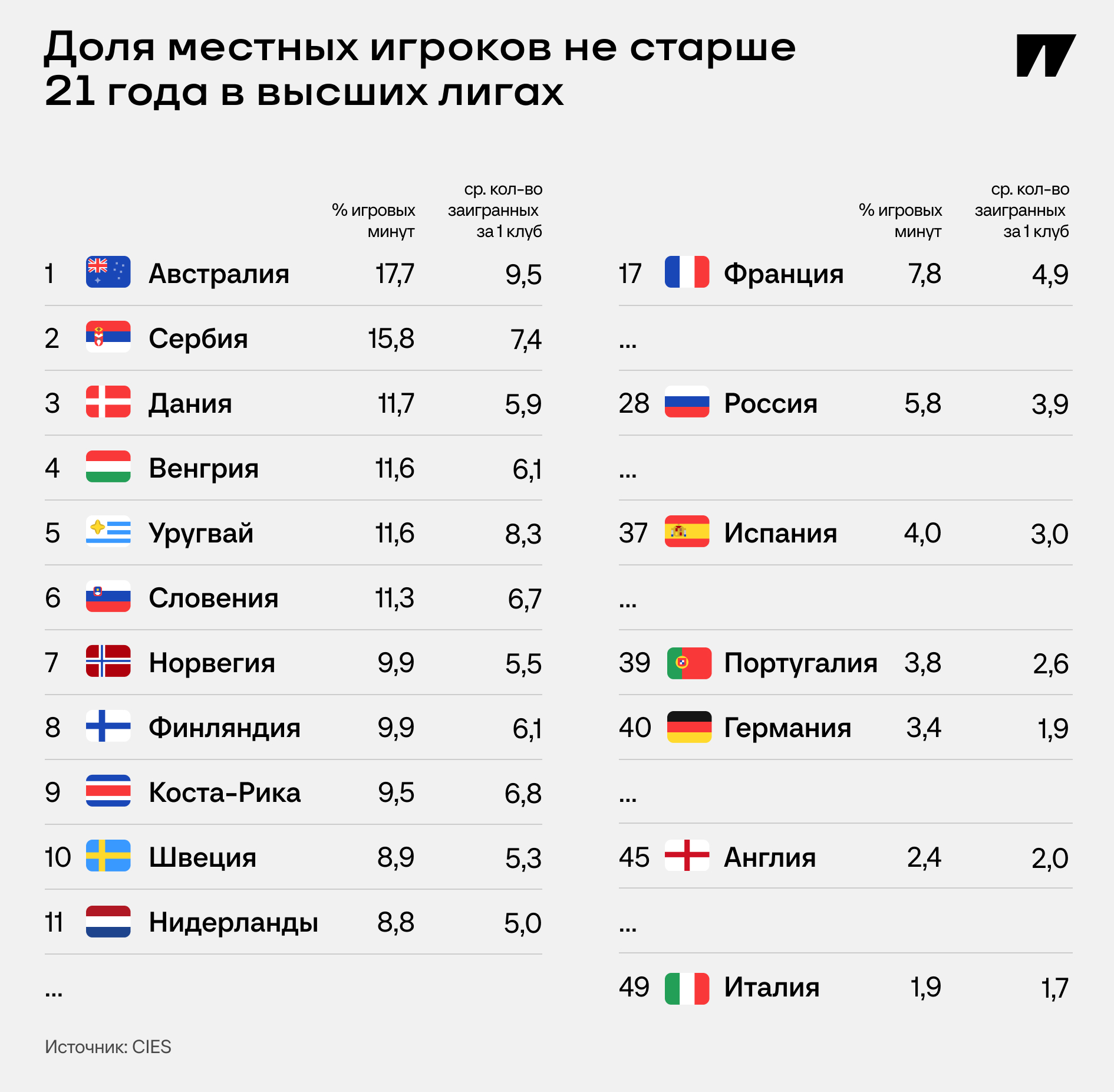 Международный центр спортивных исследований (CIES) копнул глубже: составил рейтинг лучших лиг для молодых местных (которые могут выступать за сборную страны), посчитав долю минут игроков не старше 21 года с начала года. В фокусе – 50 высших дивизионов.