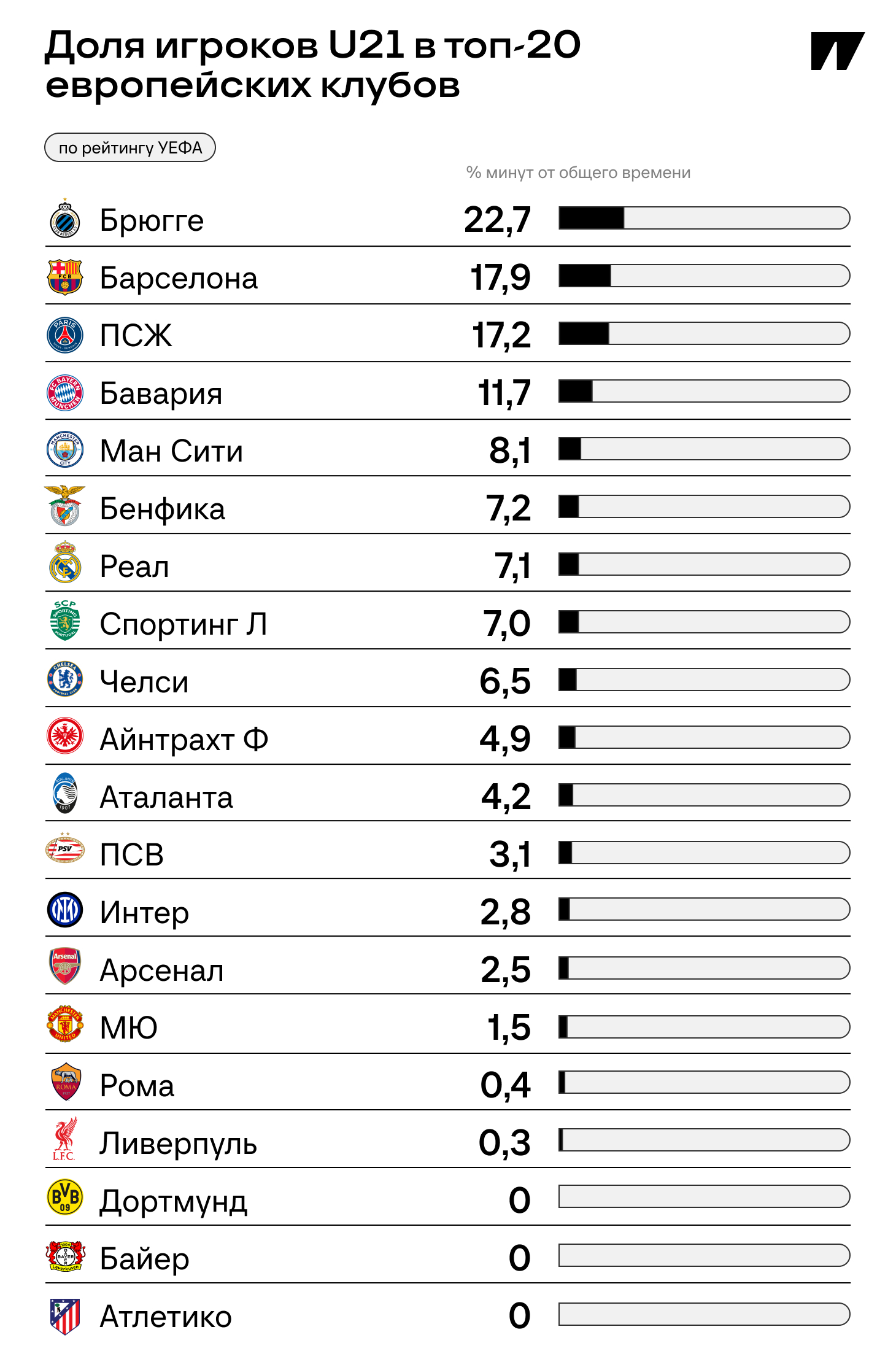 Топовые европейские клубы в этом сезоне очень по-разному подпускают молодежь к основному составу. Выделяются клубы с традиционно сильной академией («ПСЖ», «Барса», «Бавария», «Сити»), но лидер по задействованию молодежи довольно неожиданный – бельгийский «Брюгге». Сразу семь местных игроков U21 провели суммарные 3602 минуты в составе бельгийцев – больше всех у 20-летнего крайнего защитника сборной Хоакина Сейса (1063 минуты).