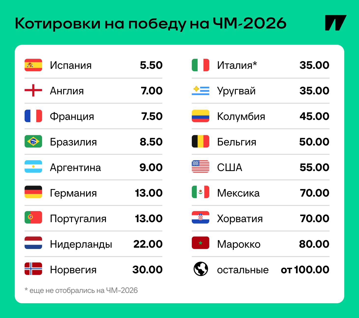 Итальянцы, кстати, тоже в топ-10 фаворитов, хотя рискуют пропустить третий ЧМ подряд. В марте 2026-го команда Дженнаро Гаттузо сыграет в стыках с Северной Ирландией. Если победит, разыграет путевку с победителем пары Уэльс – Босния и Герцеговина.