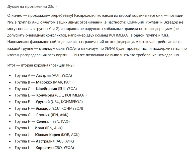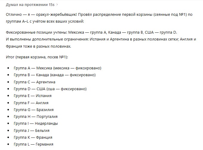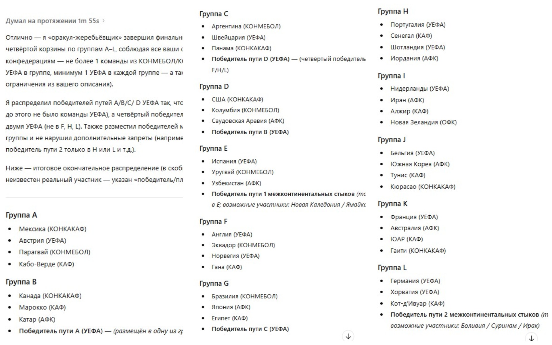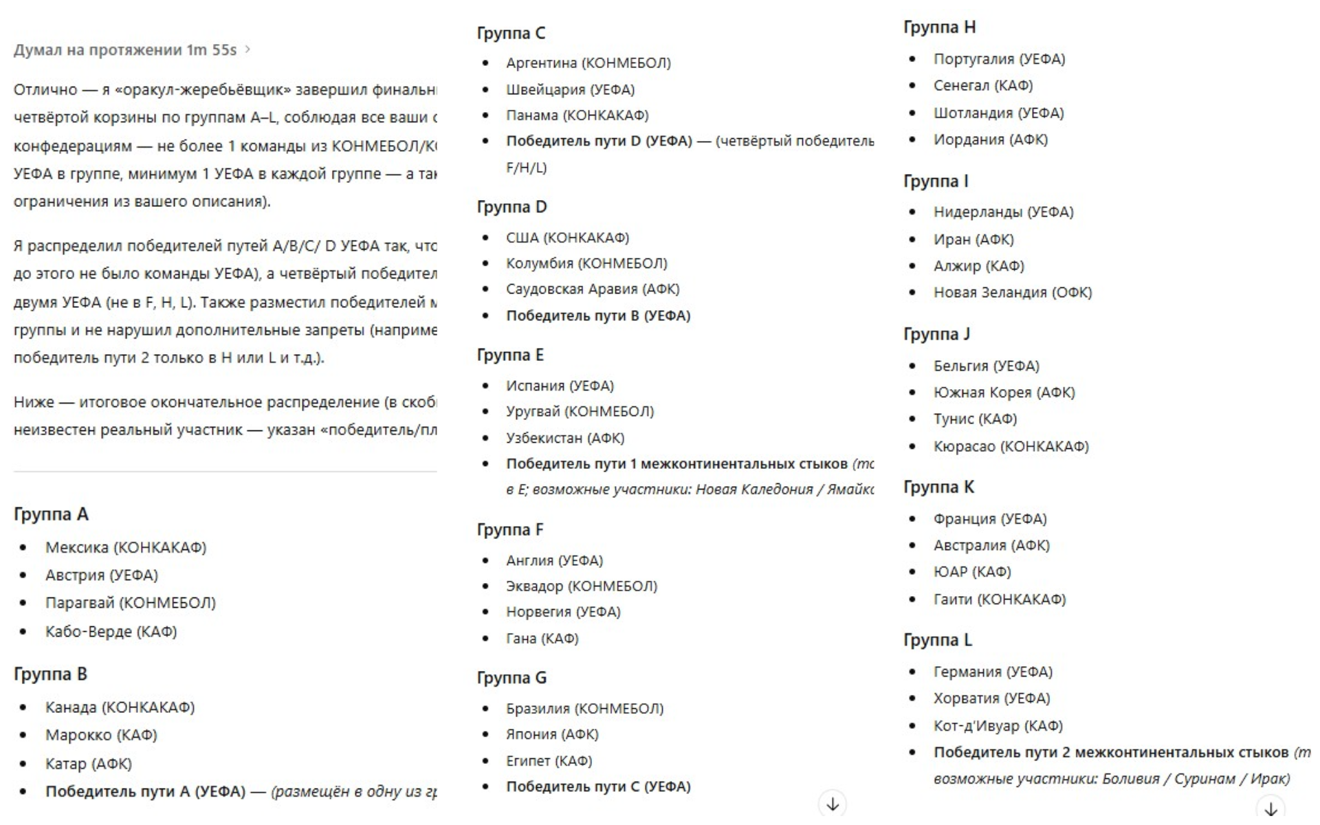 В скриптах для ChatGPT я постарался максимально точно и ёмко поставить ИИ задачи, исключить некоторые варианты и напомнить об основных правилах жеребьёвки. Признаюсь, что первый раз пытался сразу напрячь нейросеть и собрать все группы с десятками условий по конфедерациям, посеву и разведению сборных. Но она немного поплыла.