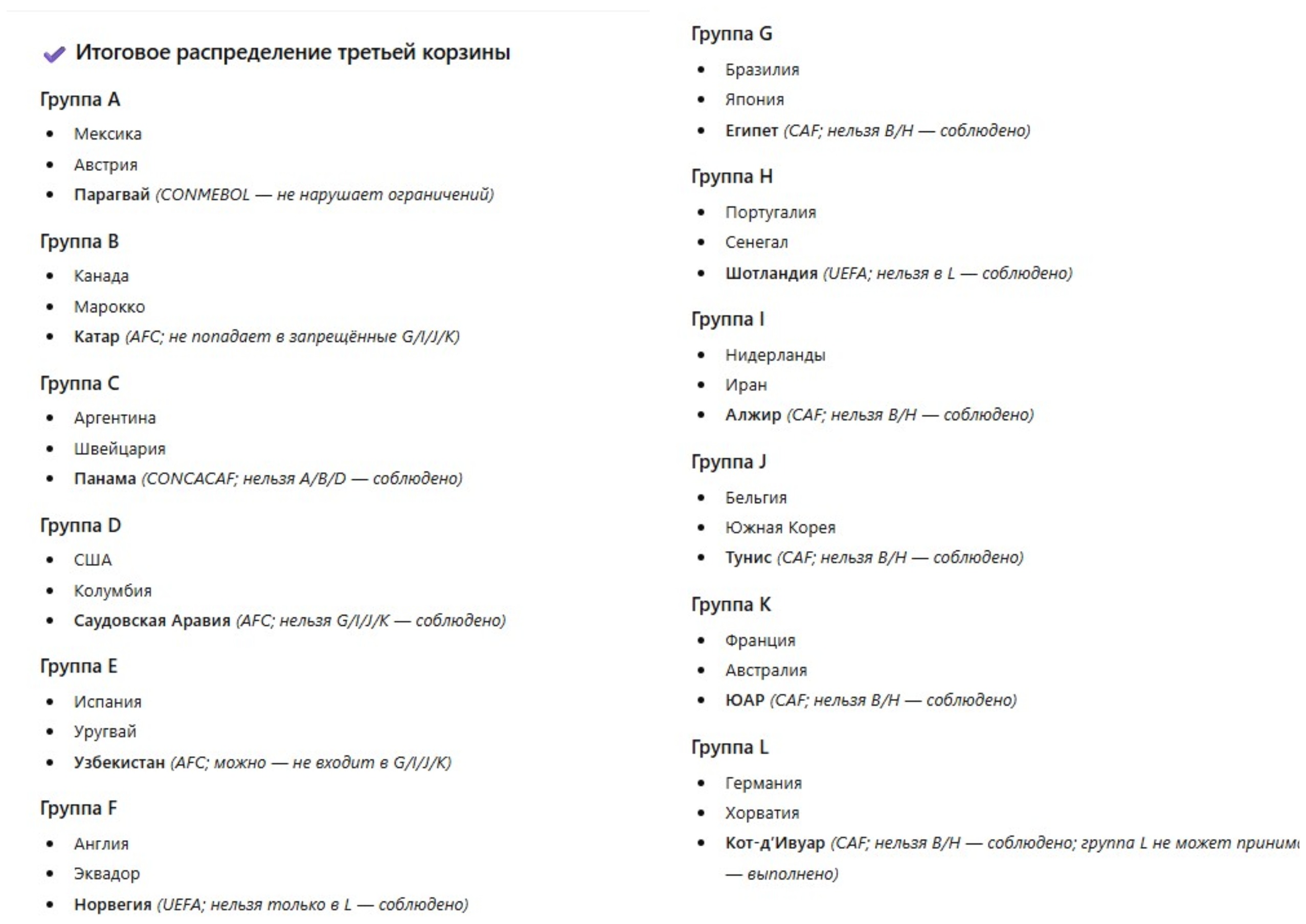 То есть, Норвегия и Шотландия не могут попасть в группу L; Панама не может оказаться в группах A, B и D; Египет, Алжир, Тунис, Кот-д'Ивуар и ЮАР не могут попасть в группы B и H; Парагвай не может попасть в группы C, D, E, F и G; Узбекистан, Катар и Саудовская Аравия не могут попасть в группы G, I, J и K.