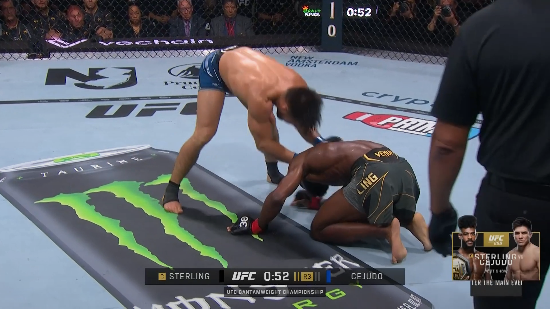 Так вот, это не единственный раз, когда Стерлинг намеренно оказывался в таком положении. Вот, например, момент из реванша против Яна: