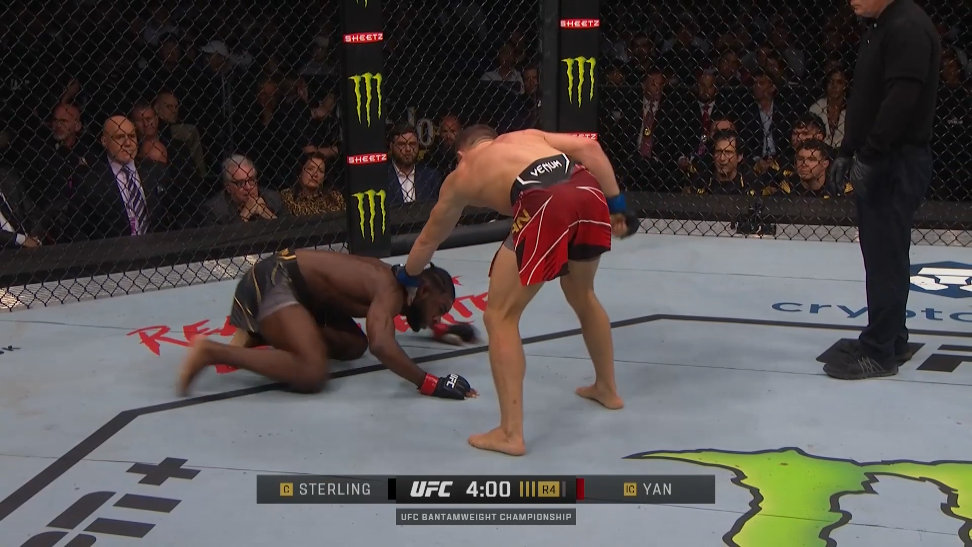 Смысл здесь, конечно, не только и не столько в том, чтобы спровоцировать соперника на удар коленом в стиле Яна. Это идеальная позиция для такого бойца, как Стерлинг – в последних поединках в легчайшем весе он проводил много тейкдаунов и часто оказывался в такой полупозиции на коленях.