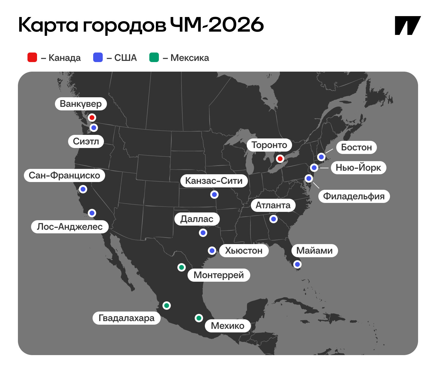 Матчи ЧМ-2026 состоятся в 16 городах США, Канады и Мексики. Чемпионат мира впервые пройдет сразу в трех странах – и станет самым большим в истории: 48 команд проведут 104 матча