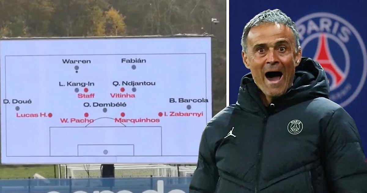По ролику видно, что это не сбой и не развлечение для публики — все выглядит продуманным жестом. Луис Энрике явно играет в психологию, показывая сопернику расстановку, которую он, по идее, не должен был видеть. И при этом состав на экране — чистый эксперимент: Дембеле в опорной зоне, Фабиан Руис — на позиции форварда, нестандартные роли по всему полю.