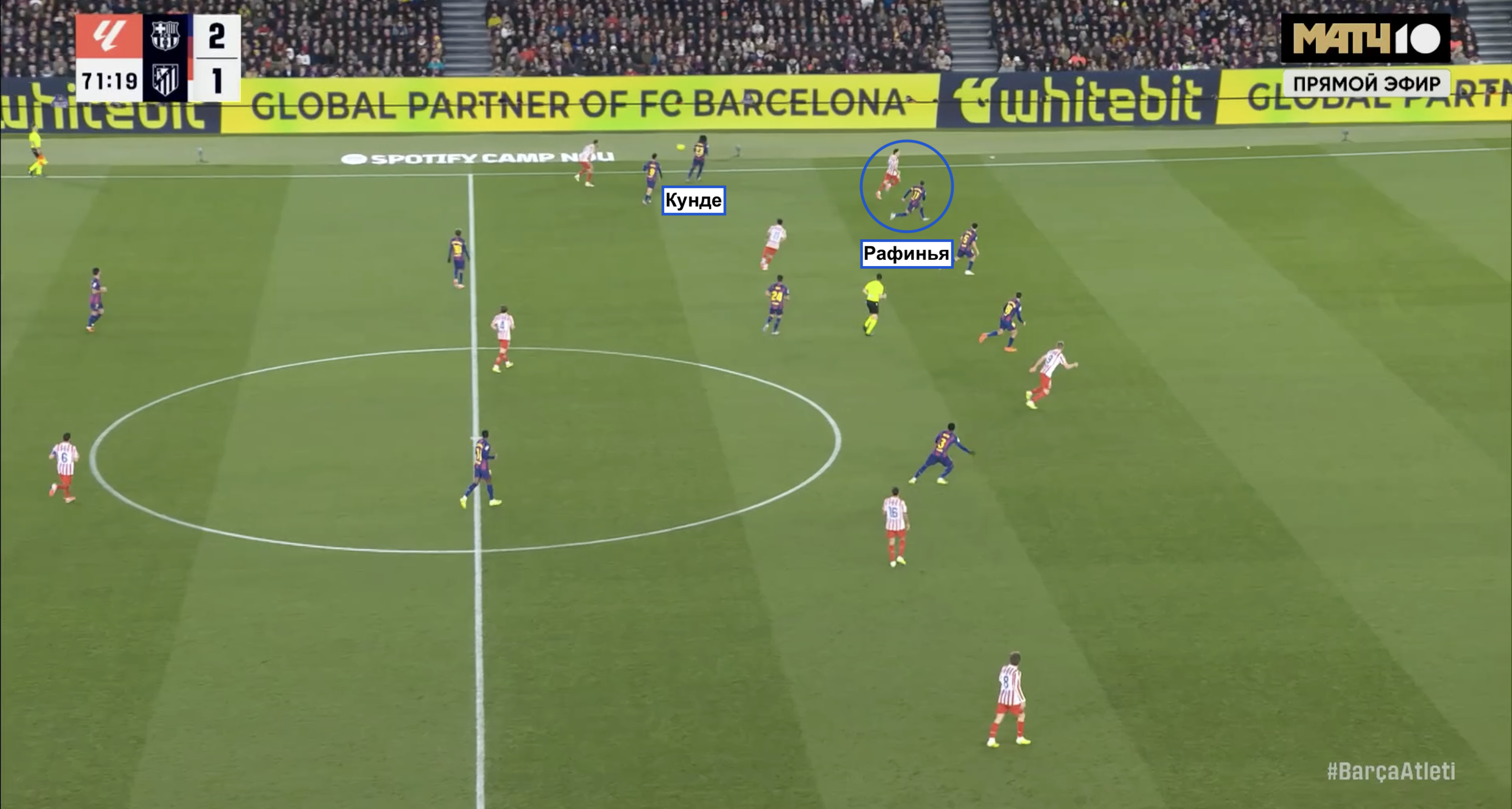 В матче против «Атлетико» (3:1) нельзя было не отметить выдающуюся игру Рафиньи, одного из лидеров нынешней «Барселоны». В основном разборе игры его действиям не было уделено должного внимания.