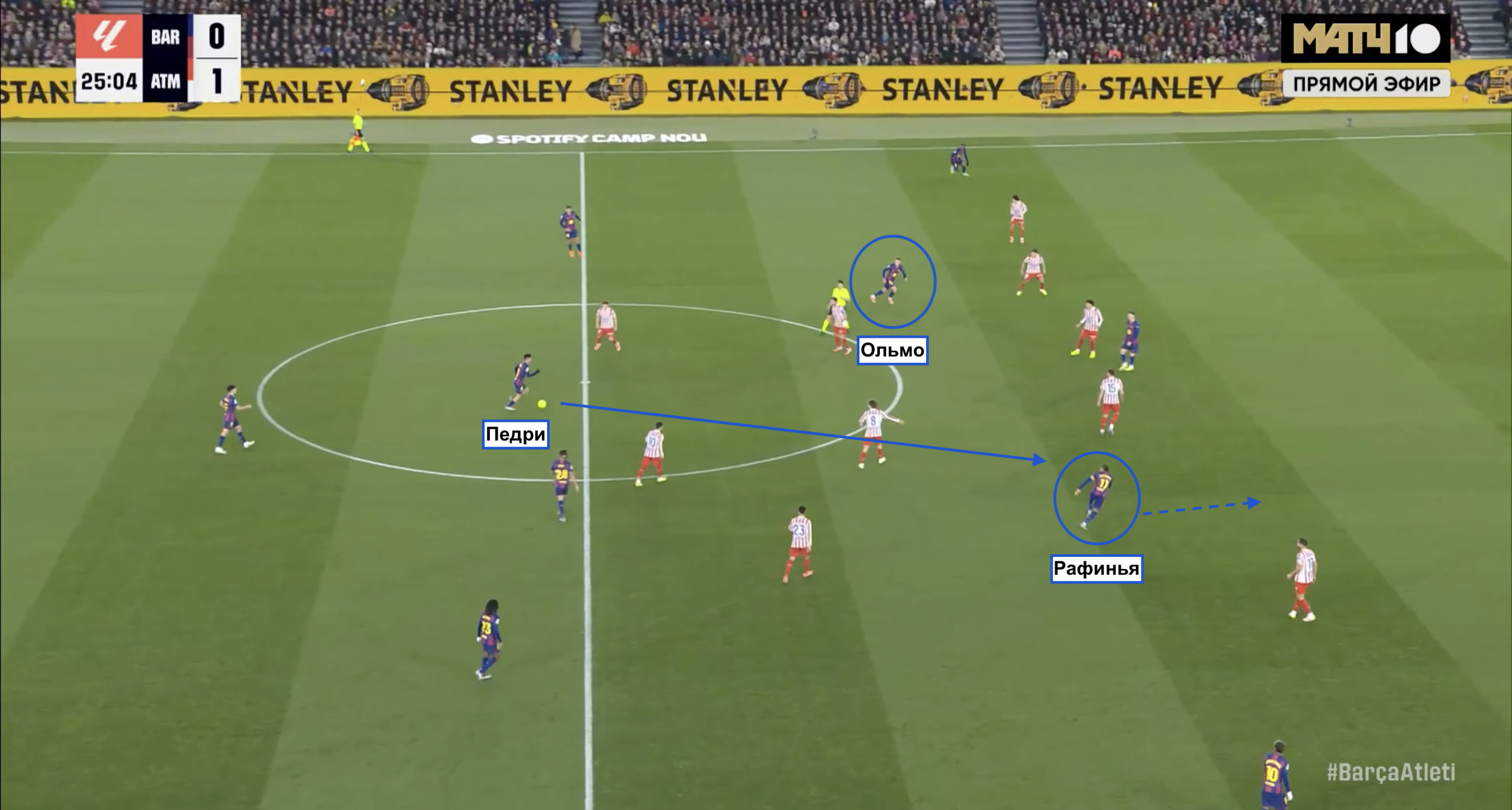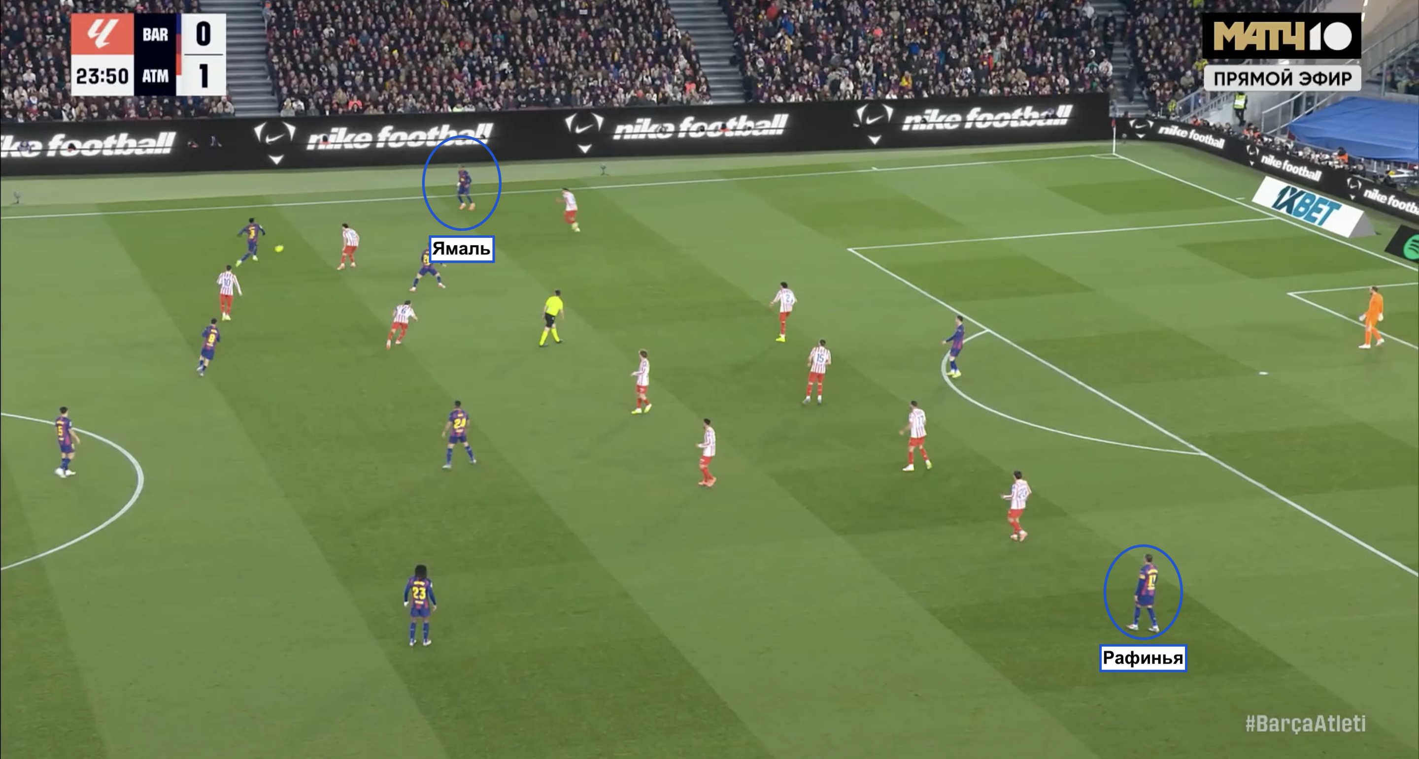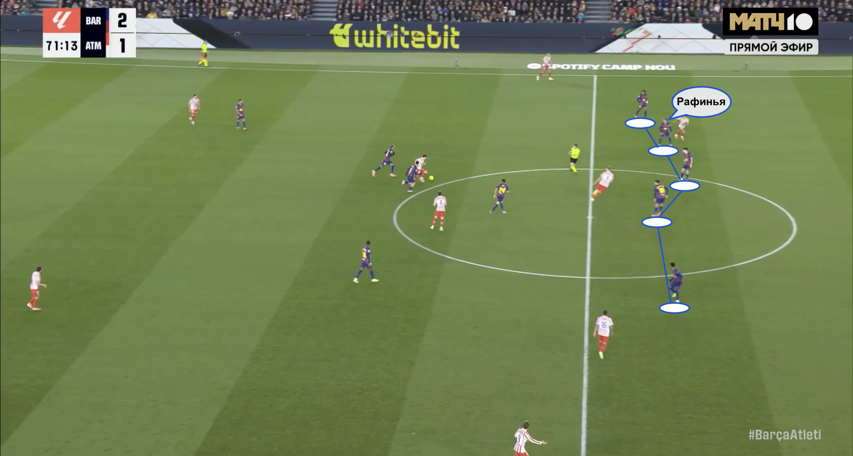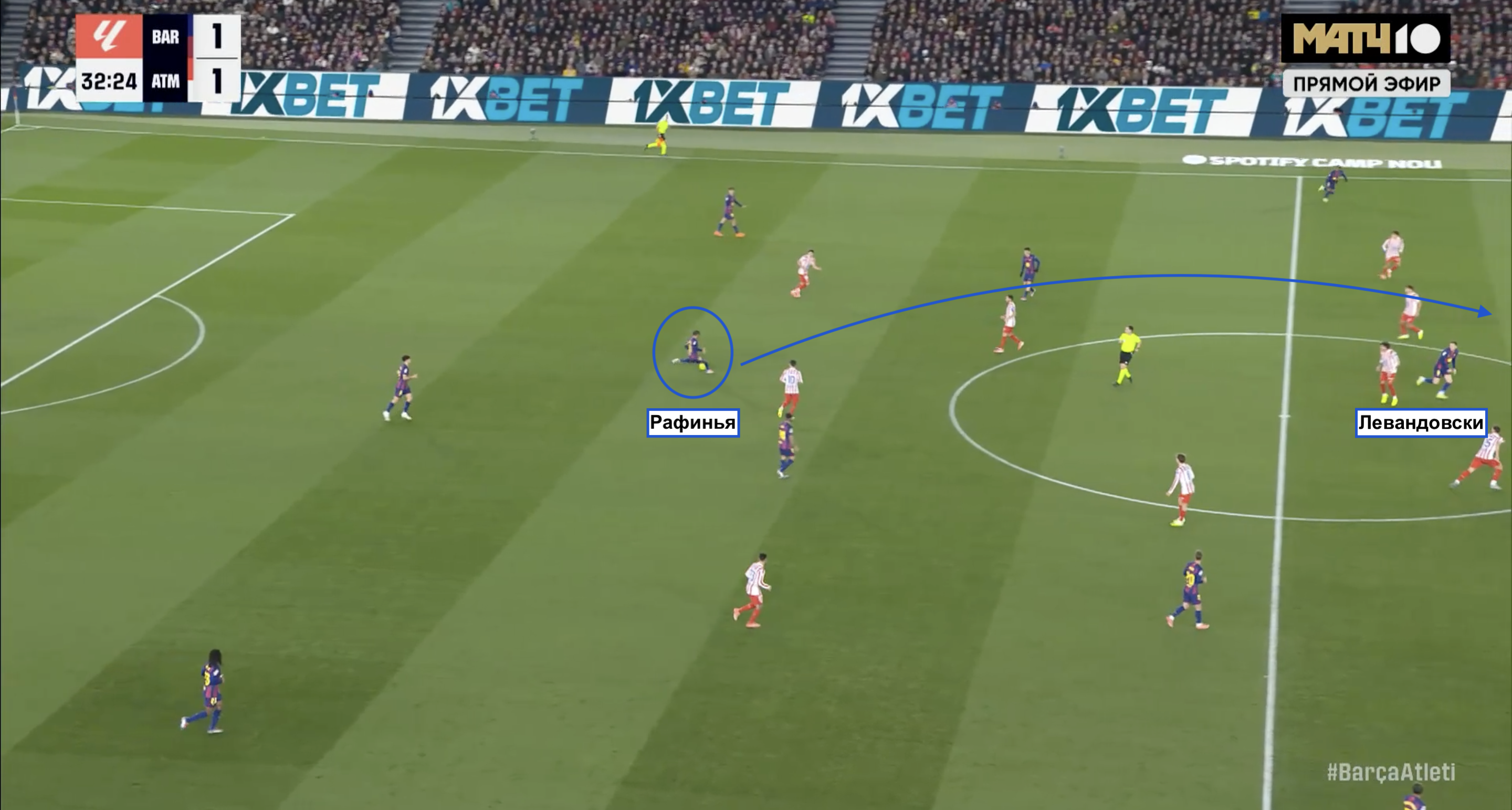 В одном эпизоде Рафинья спустился в опорную зону, чтобы получить мяч. Настолько же неожиданным это стало для линии обороны «Атлетико». Последовал высококачественный заброс из глубины от Рафиньи на открывающегося за спину защитникам соперника Левандовского.