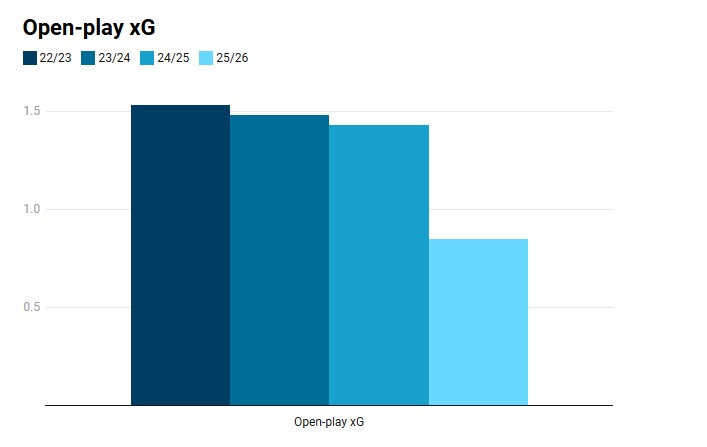 Таким образом, мы имеем тенденцию: без учета стандартных положений «Рейнджерс» создает xG почти вдвое меньше по сравнению с последними сезонами.