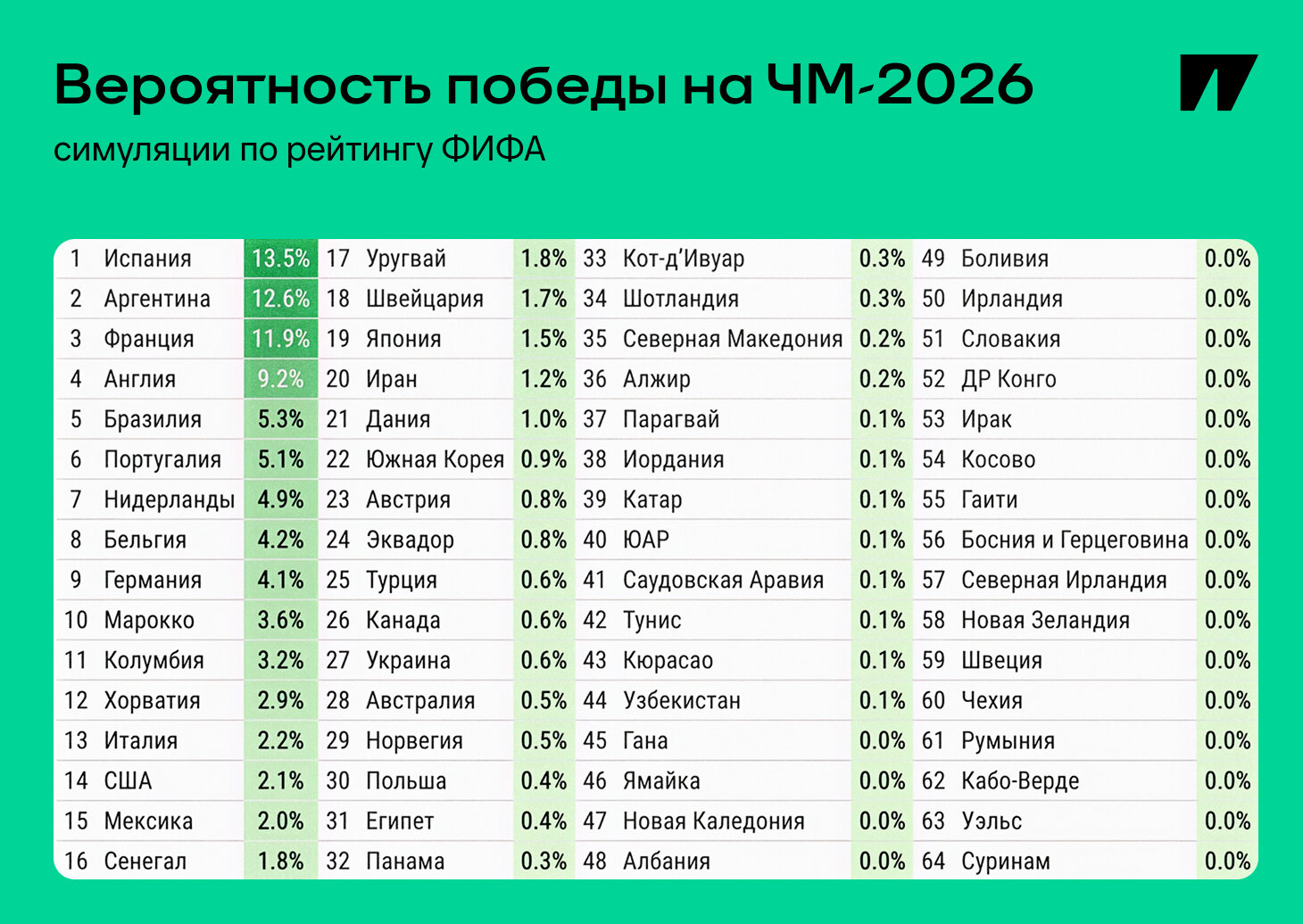 После жеребьевки ЧМ-2026 мы провели несколько тысяч симуляций матчей уже сформированных групп, а далее – прогнали игры плей-офф. Силу команд определяли на базе рейтинга ФИФА – да, у этого метода есть минусы, потому что мы опираемся исключительно на результаты. Но доступных продвинутых данных по всем сборным нет. А даже если бы они были, мы все равно упираемся в проблему из первого абзаца.