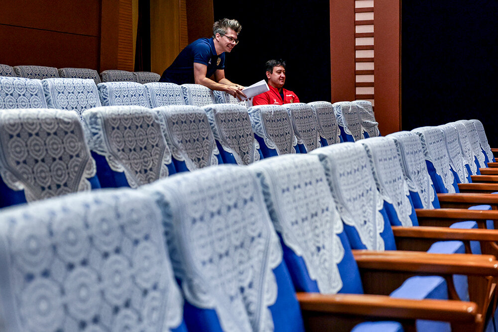 Для корейских болельщиков приезд сборной России стал большим событием. Никакой рекламы предстоящих матчей в городе незаметно – рекламы здесь в принципе нет. Но и без пиара на стадион пришли больше восьми тысяч человек. Отдельный сектор на стадионе заполнили российские болельщики. На арену пришли сотрудники посольства, россияне, живущие в Пхеньяне, и хоккейная команда Приморского края, которая тоже приехала сыграть несколько товарищеских матчей с КНДР и живет с нами в одном отеле.