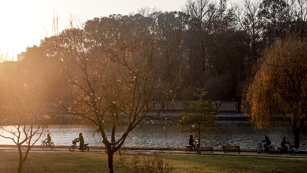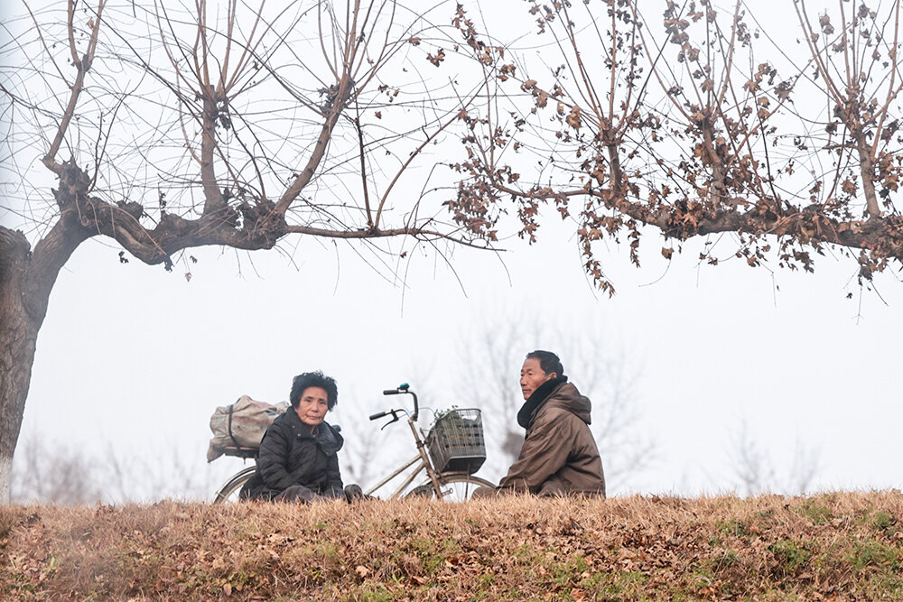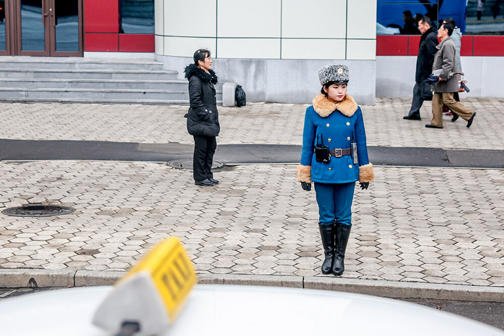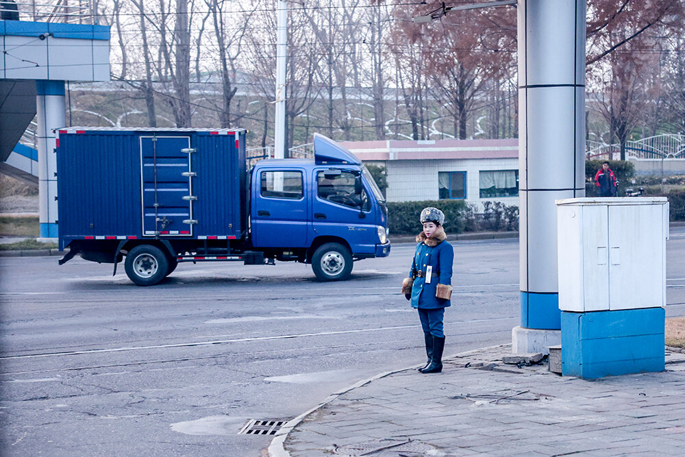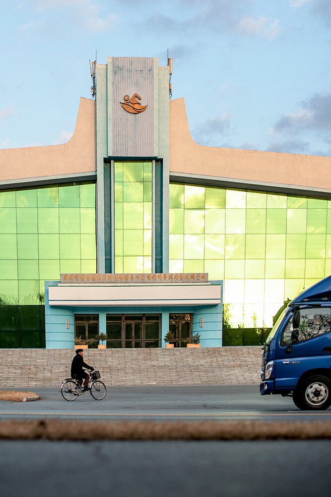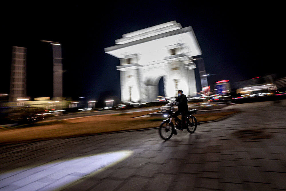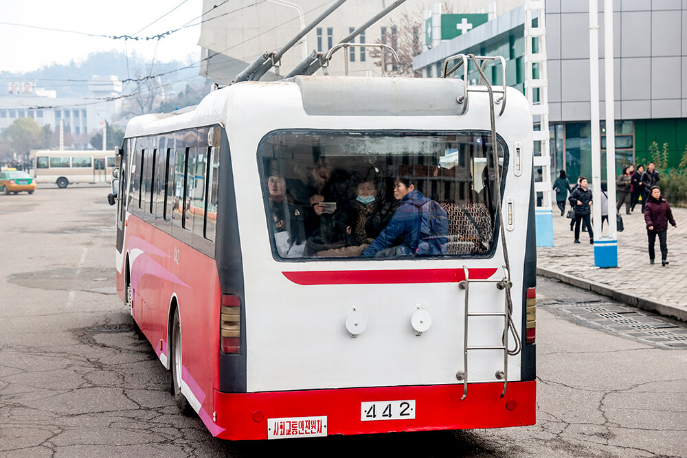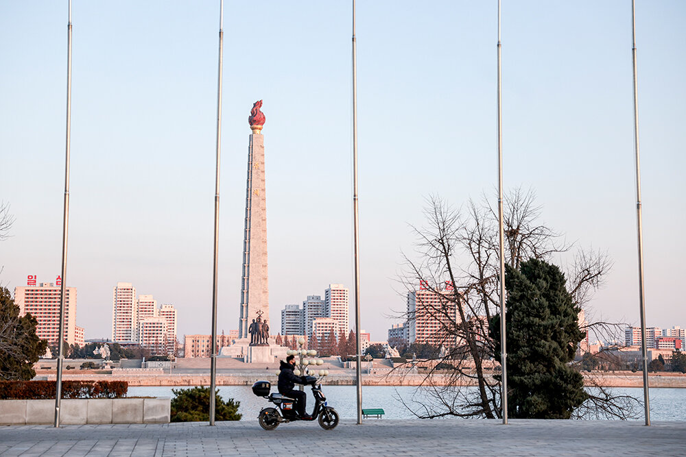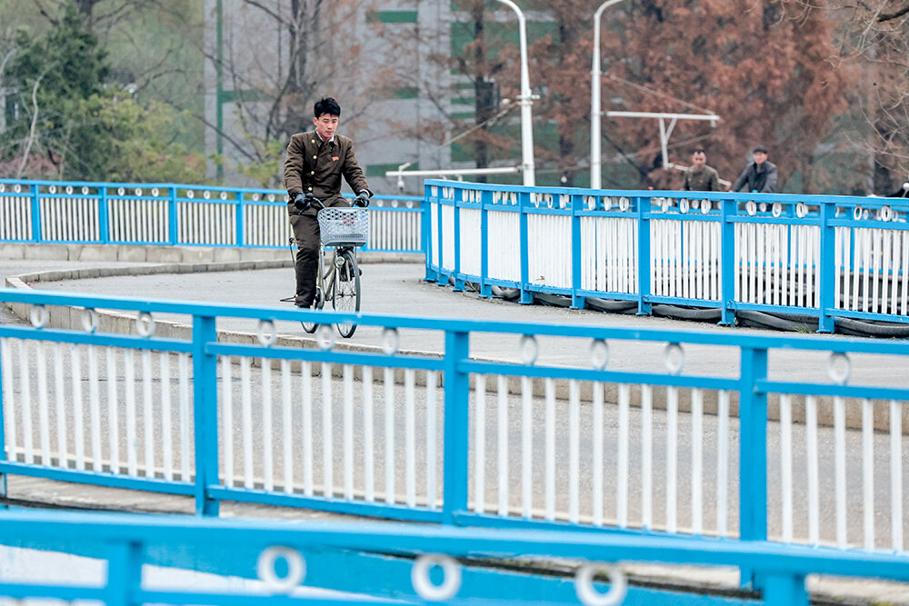 На въезде в город блокпост. Автобус остановили военные – попасть в Пхеньян даже местные могут, только если есть разрешение. В городе машин на дорогах уже гораздо больше, но главные впечатление – чистота и огромное количество велосипедистов. Велосипеды в основном электрические, и гоняют на них почти так же, как московские курьеры. Только машины их не пропускают на «зебрах», а наоборот – наш водитель то и дело недовольно сигналил.
