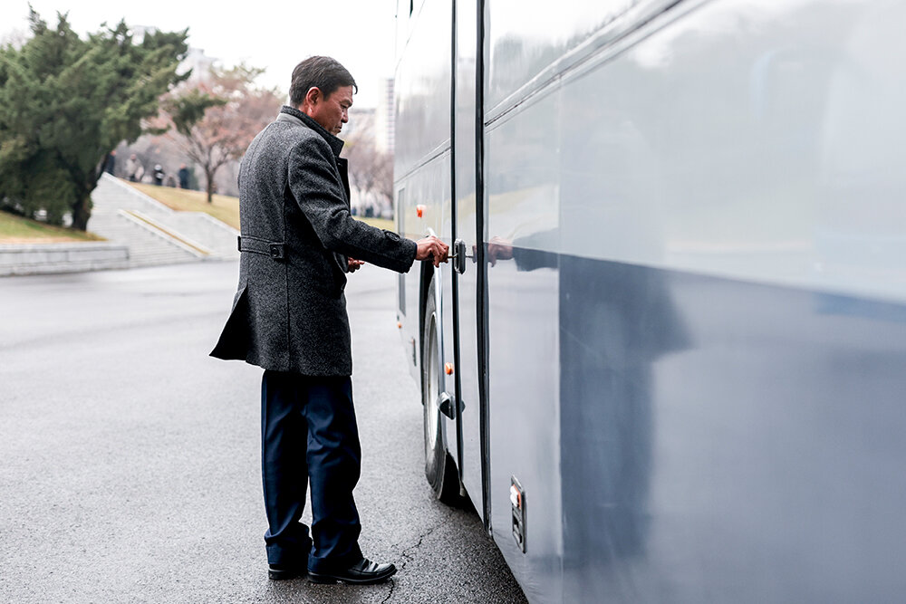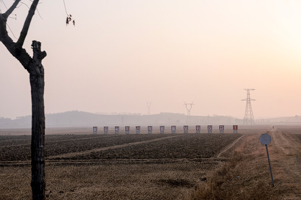 Три фазы досмотра мы проходили столько же, сколько летели. Но в итоге всех пропустили, и даже багаж остался с нами. Сразу на выходе нас встретили сопровождающие из местных. Без них иностранцы в КНДР перемещаться не могут. Вместе сели в автобус и поехали по абсолютно пустому шоссе. Вокруг поля, портреты вождей и крупные надписи на корейском.