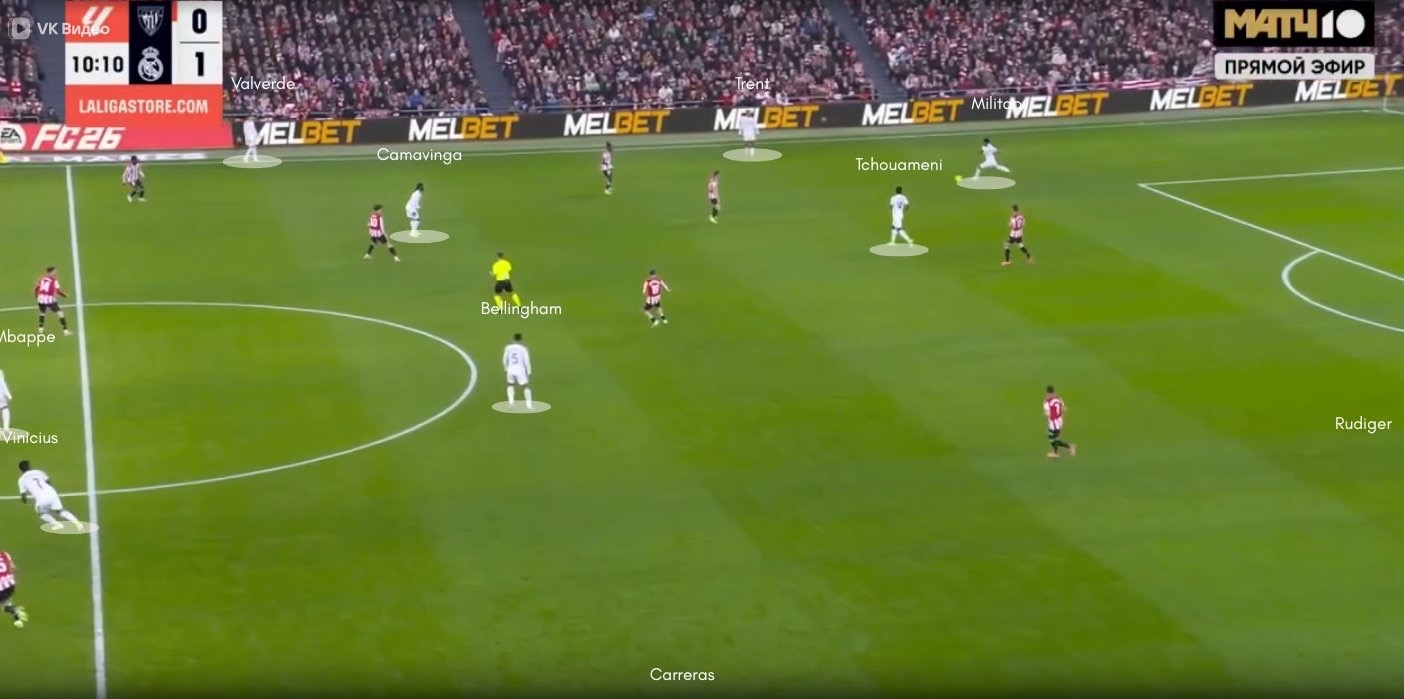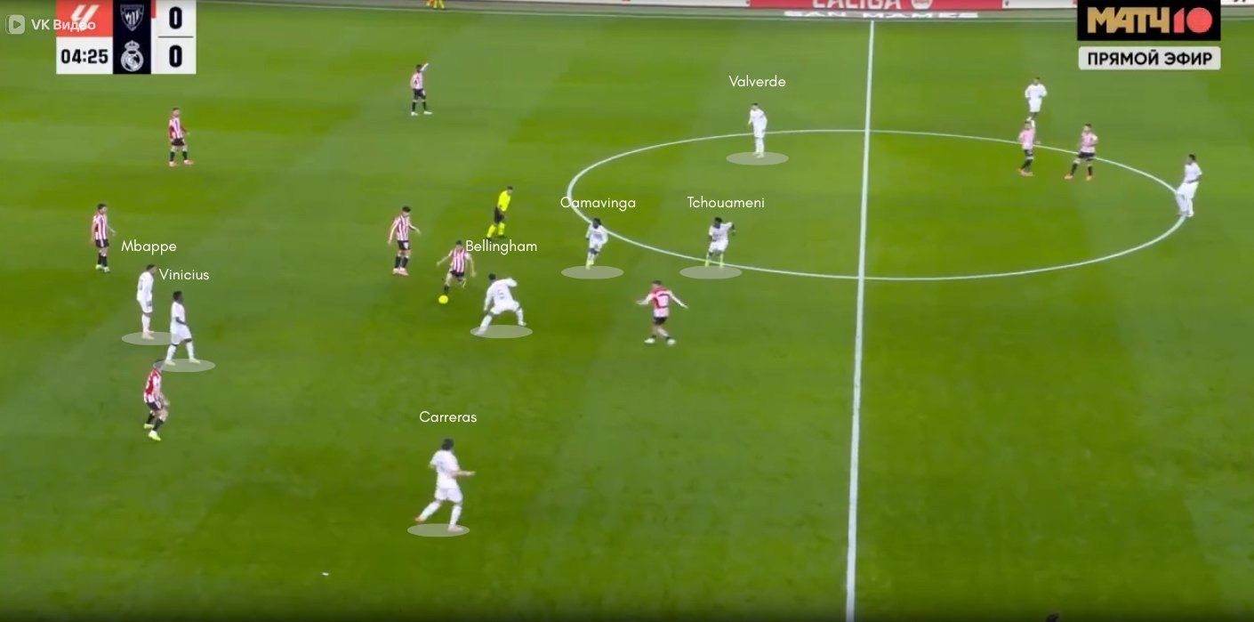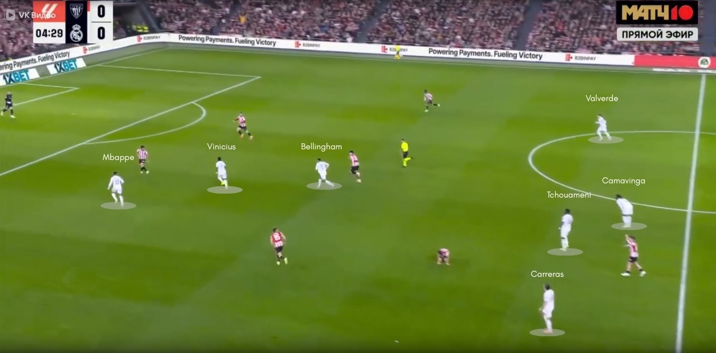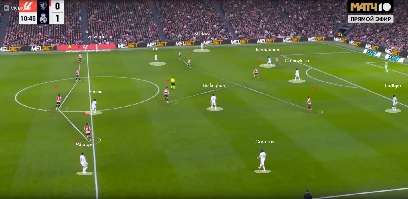 Первый пункт особенно важен: часто можно было увидеть, как Камавинга занимает позицию Тчуамени (как третий ЦЗ/опорный полузащитник), Милитао играет на позиции правого защитника, Мбаппе смещается во фланги, в то время как Вини уходит в центр.