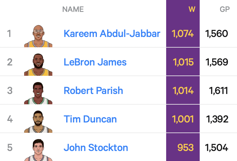● Также Леброн одержал 1015 победу в регулярном сезоне и опередил Роберта Пэриша. До повторения рекорда Карима осталось всего 59 побед.