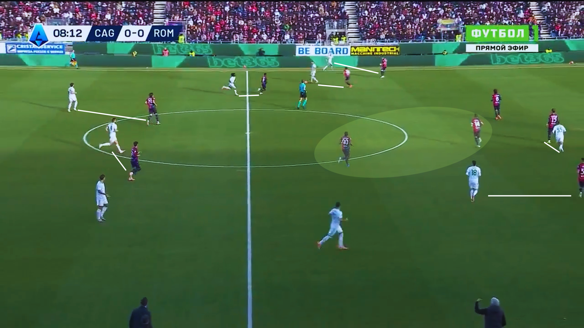 С мячом Пизакане отказался от поступательного строительства и некоторых фирменных приемов (например, рискованное увеличение численности у мяча ради освобождения флангов). Вместо этого почти всегда выходил длинным пасом, чтобы обойти персоналки «Ромы», и искал пространство за спинами. Это не привело к голу (его забили с углового), но сработало, потому что технически и физически атака «Кальяри» превзошла римскую оборону: получалось и цепляться, и разбегаться на пространстве.