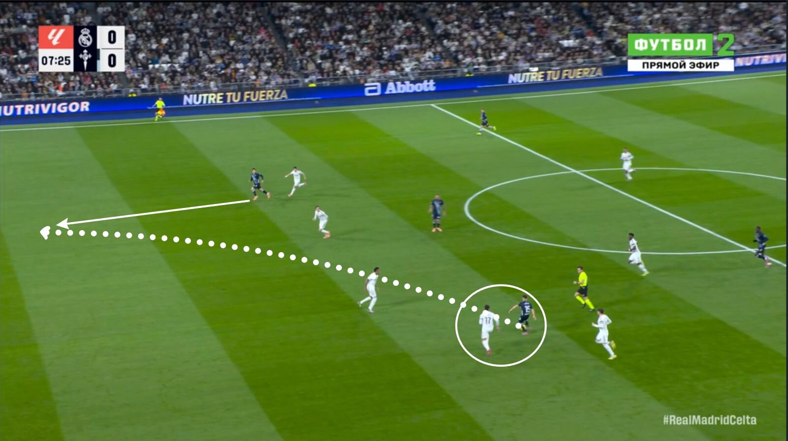 Другое оружие «Сельты» – рывки за спину. Гости пользовались недоработками Мбаппе и Винисиуса в прессинге и после удачных розыгрышей сразу делали закидушки или пас низом под рывок одного из атакующих игроков.
