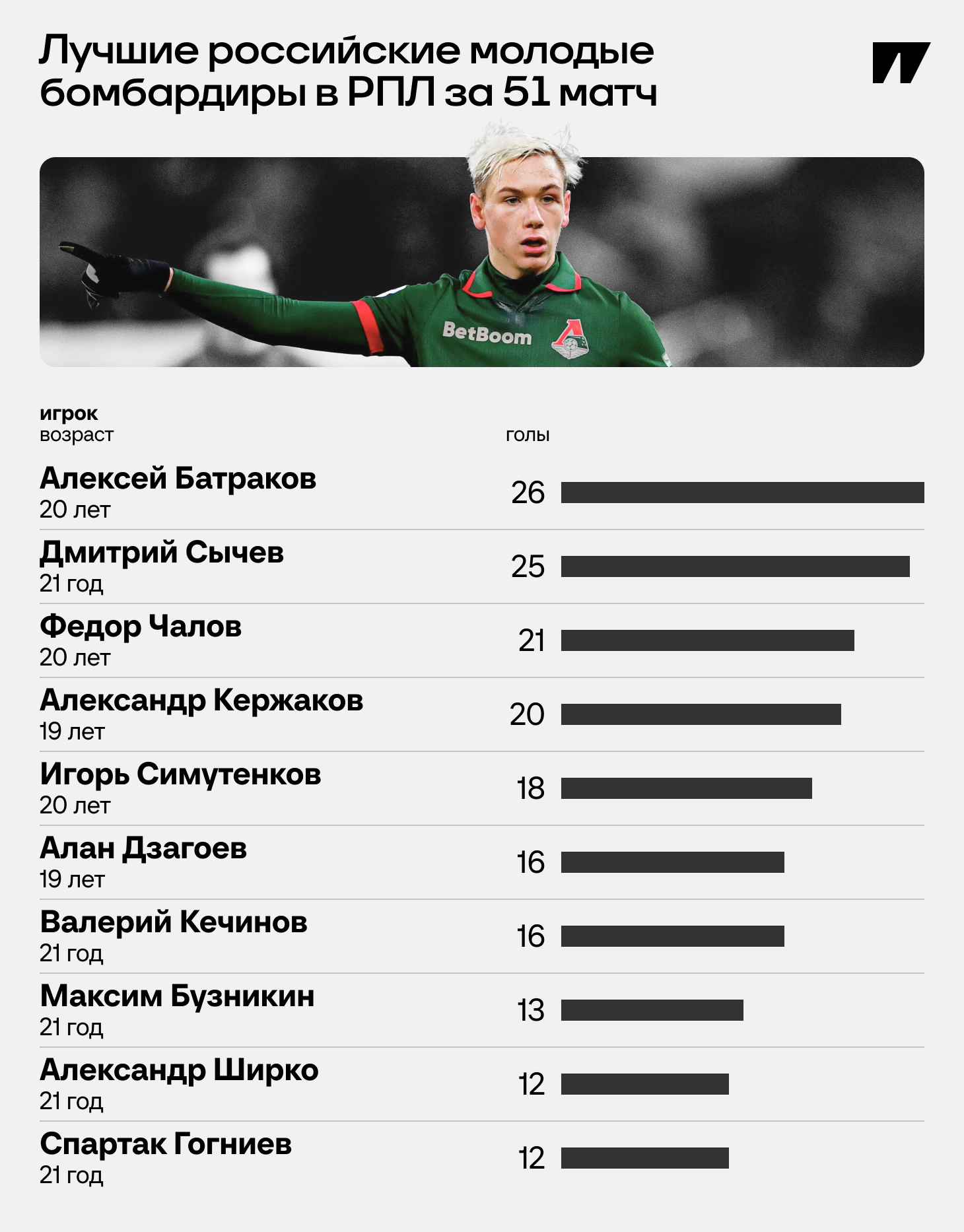 У 20-летнего Батракова 26 мячей за 51 игру. На этой отсечке атакующий полузащитник «Локо» лидирует по голам среди молодых российских игроков.