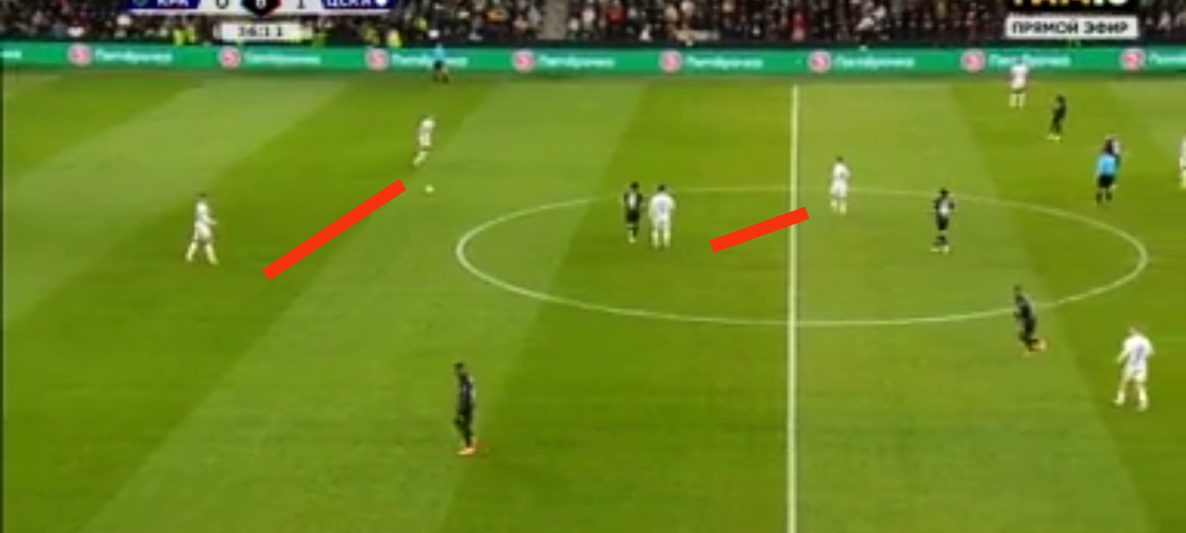 Вроде бы тут тоже ничего сложного: просто опустить Облякова в линию и сесть поплотнее в привычные по сезону 4-4-2, которые несколько месяцев назад сдержали «Краснодар» без особых проблем. Но на деле даже здесь ромб не мог нормально переформатироваться. Дальше просто накидаю вам пару скринов без объяснения происходящего на них – структура ЦСКА опишет его лучше любых слов.