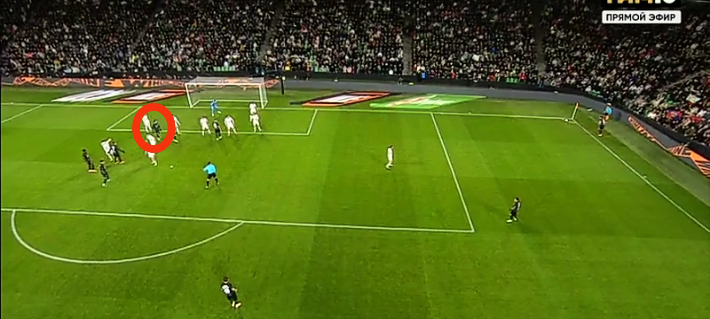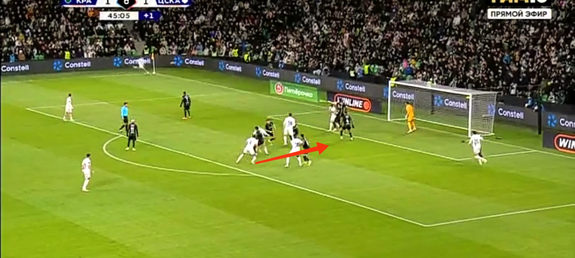 ЦСКА же (а если быть точнее, конкретно Жоао Виктор) воспользовался более попсовым, но не менее эффективным приëмом – выбеганием из глубины. Вот Виктор стартует из-за пределов штрафной, из-за чего остаётся незамеченным: