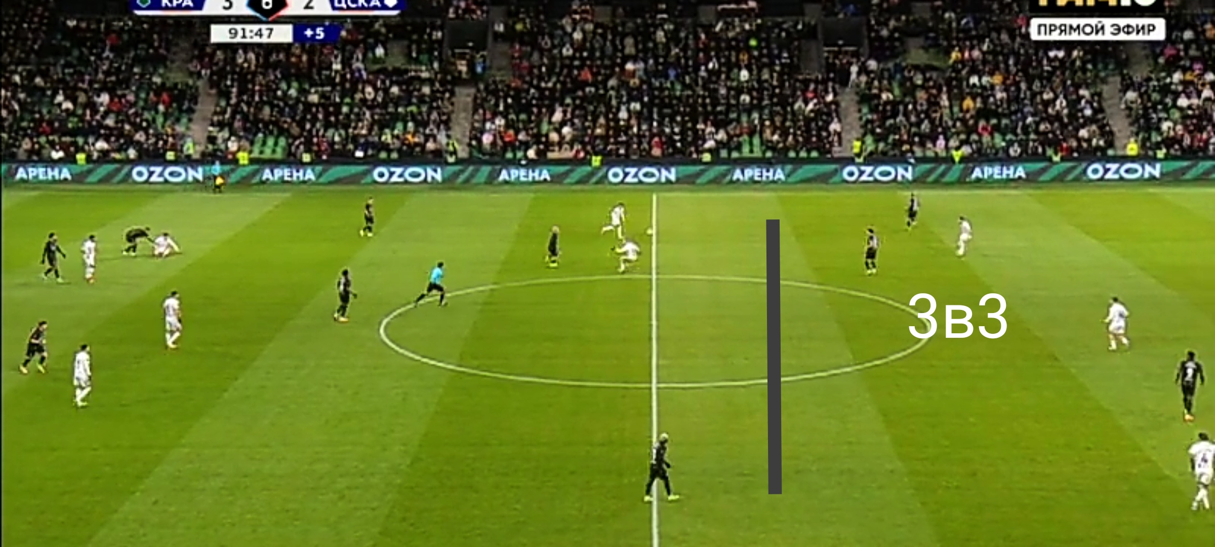 В таких условиях часто приходилось наоборот перегружать билд-ап. Радикальнее всего при ударах от ворот, где гости выстраивались в 3-4-3. «Краснодар» прессингует персонально, но это всё-таки не «ПСЖ», «Бавария» или «Рома», так что стабильно сохранять 1в1 осмеливались не всегда. Здесь «армейцам» дышалось получше, но что после розыгрыша делать всего лишь трём игрокам впереди – непонятно.