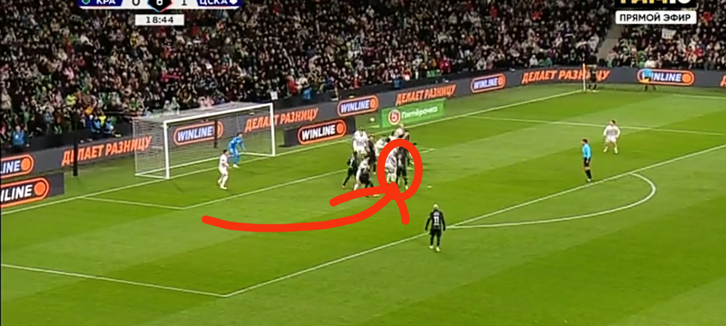 «Армейцы» легко избавились от этого блока – вместо забега на ближнюю по прямой сначала пошли на мяч, и лишь потом к воротам. При этом «быки» как стадные животные побежали за ними на ближнюю штангу в полном составе, даже не обратив внимание, что Мойзес вместо ближней пошёл на дальнюю. Ближайшим к нему игроком был Черников, но винить его в этой ситуации я бы не стал – задачей, по видимому, был блок, а не персональная опека.