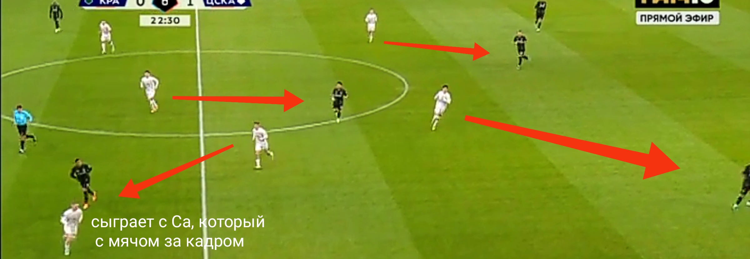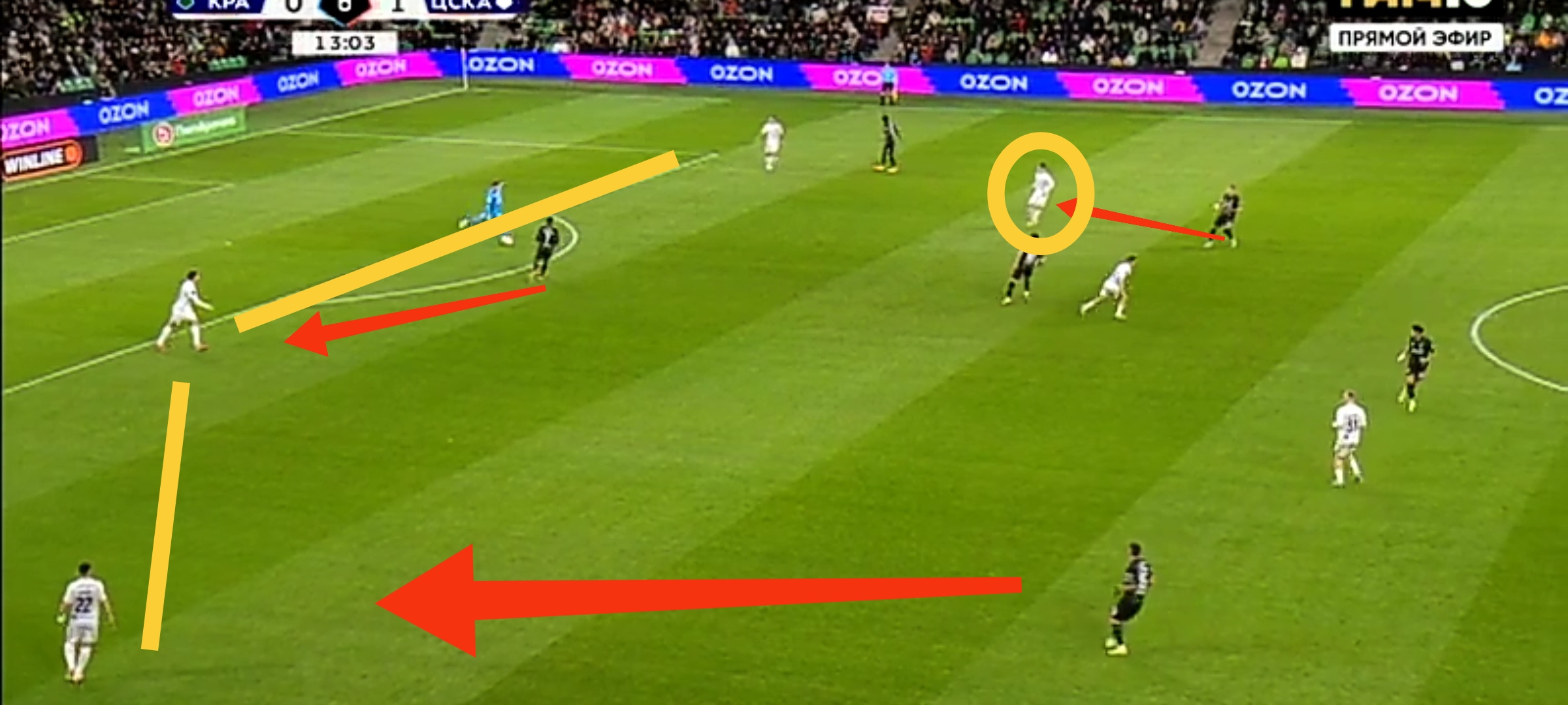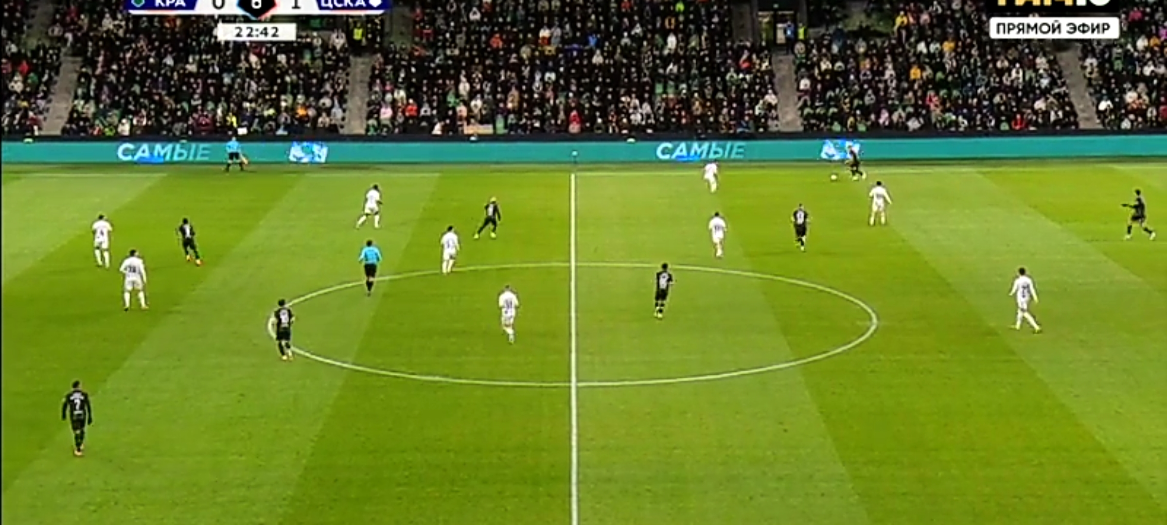 Челистини не захотел усиливать билд-ап под отлично прессингующий «Краснодар», а попытался сохранить привычный минимализм с традиционными для «армейцев» 3+1, которые иногда превращались в 2+2 или даже 2+1. Естественно, получили за это <5 PPDA от «чëрно-зелёных» (напоминаю, что меньше=лучше) и смешные 73% точности передач, ведь с таким билд-апом из-под таких персоналок можно выйти только через длинную передачу, но своего Кордобы, Соболева или хотя бы Луиса Энрике у ЦСКА нет.