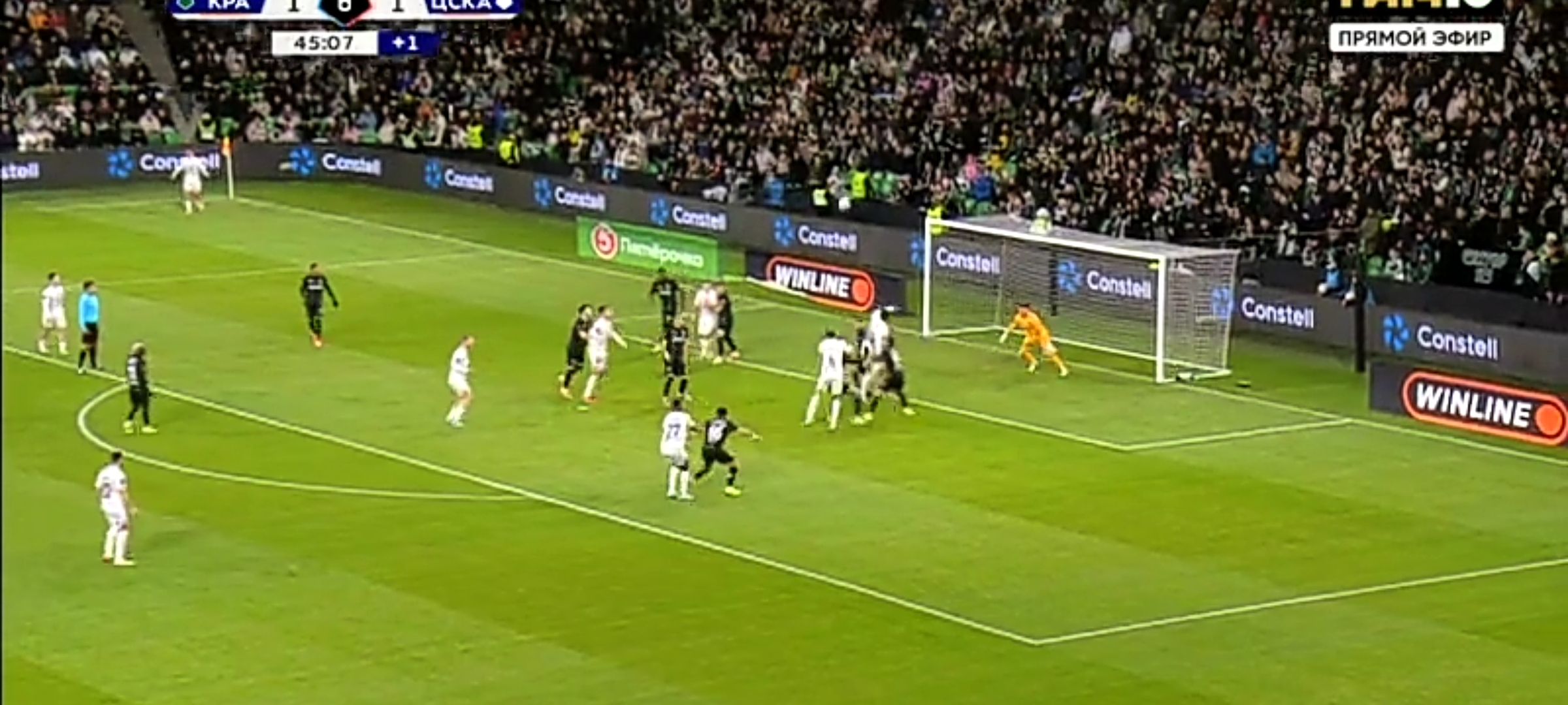 Что-то подобное мы видели и в обратную сторону. ЦСКА всеми силами наваливается вперёд, но проигрывает борьбу и получает 3 в 3 на свои ворота. Из этой атаки «быки» получают опаснейший момент, но Перрен немного не попал в створ.