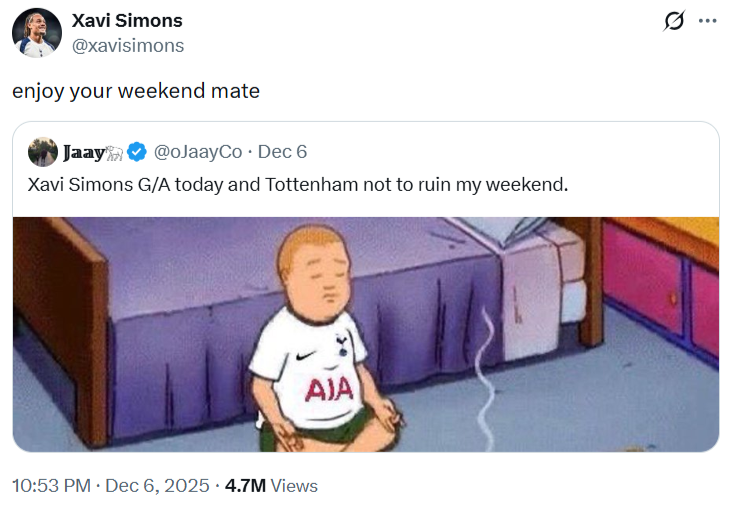 Днем 6 декабря болельщик «Тоттенхэма» оставил шуточных пост в X: «Хочу «гол+пас» Хави Симонса сегодня, пусть «Тоттенхэм» не испортит мои выходные».