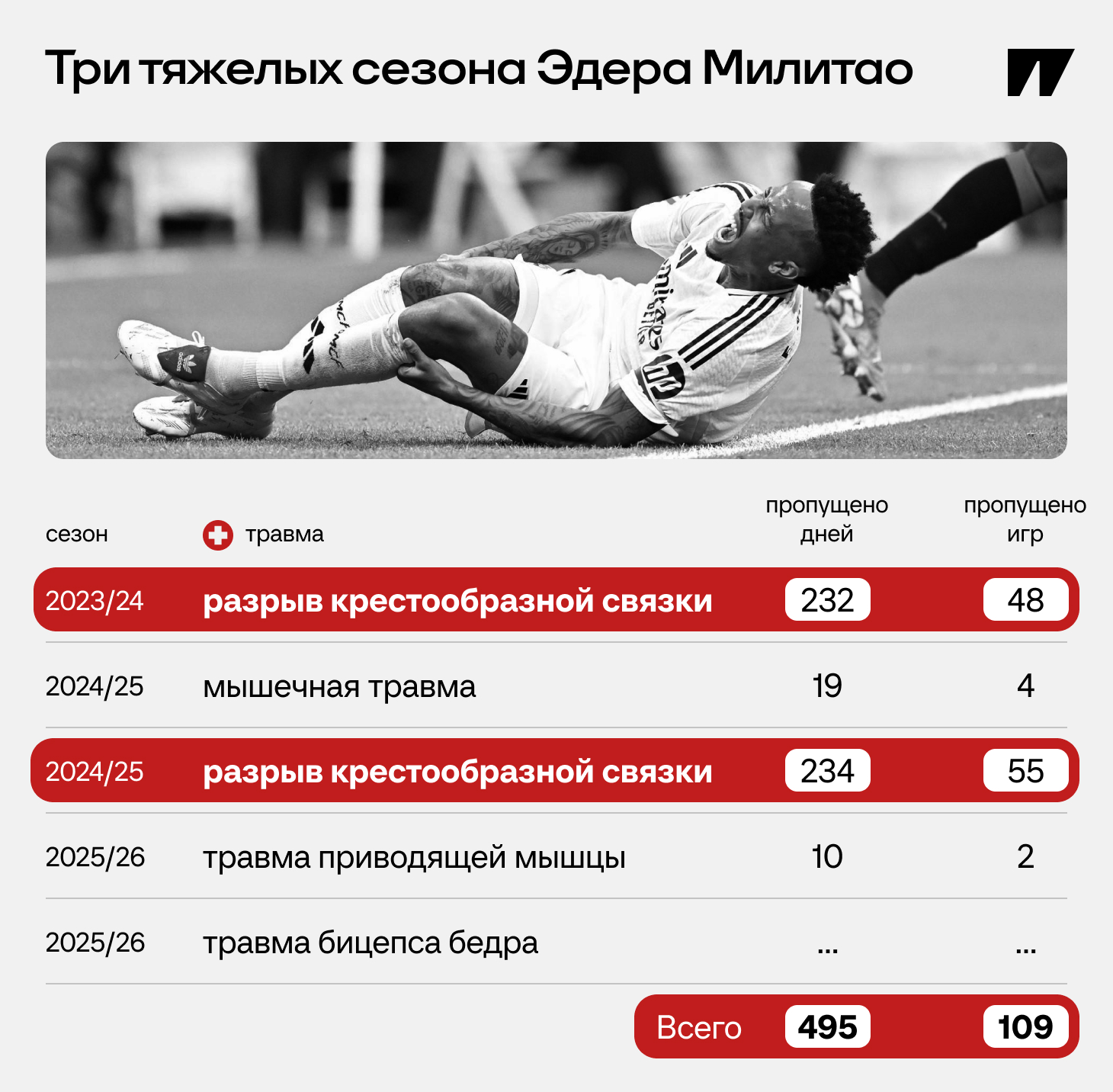 ● Вскоре Милитао стал лидером «Реала», а в ноябре 2024-го снова трагедия – кресты на ровном месте в матче с «Осасуной». Бразилец получил полный разрыв передней крестообразной связки с поражением обоих менисков правой ноги и вернулся только на клубной чемпионате мира.