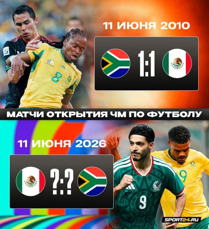 В первом матче Чемпионата Мира встретятся сборные Мексики и ЮАР. Интересно что эти же команды встречались в первом матче ЧМ 2010 ровно 16 лет назад, тогда команды сыграли в ничью, матч закончился с счетом 1:1.