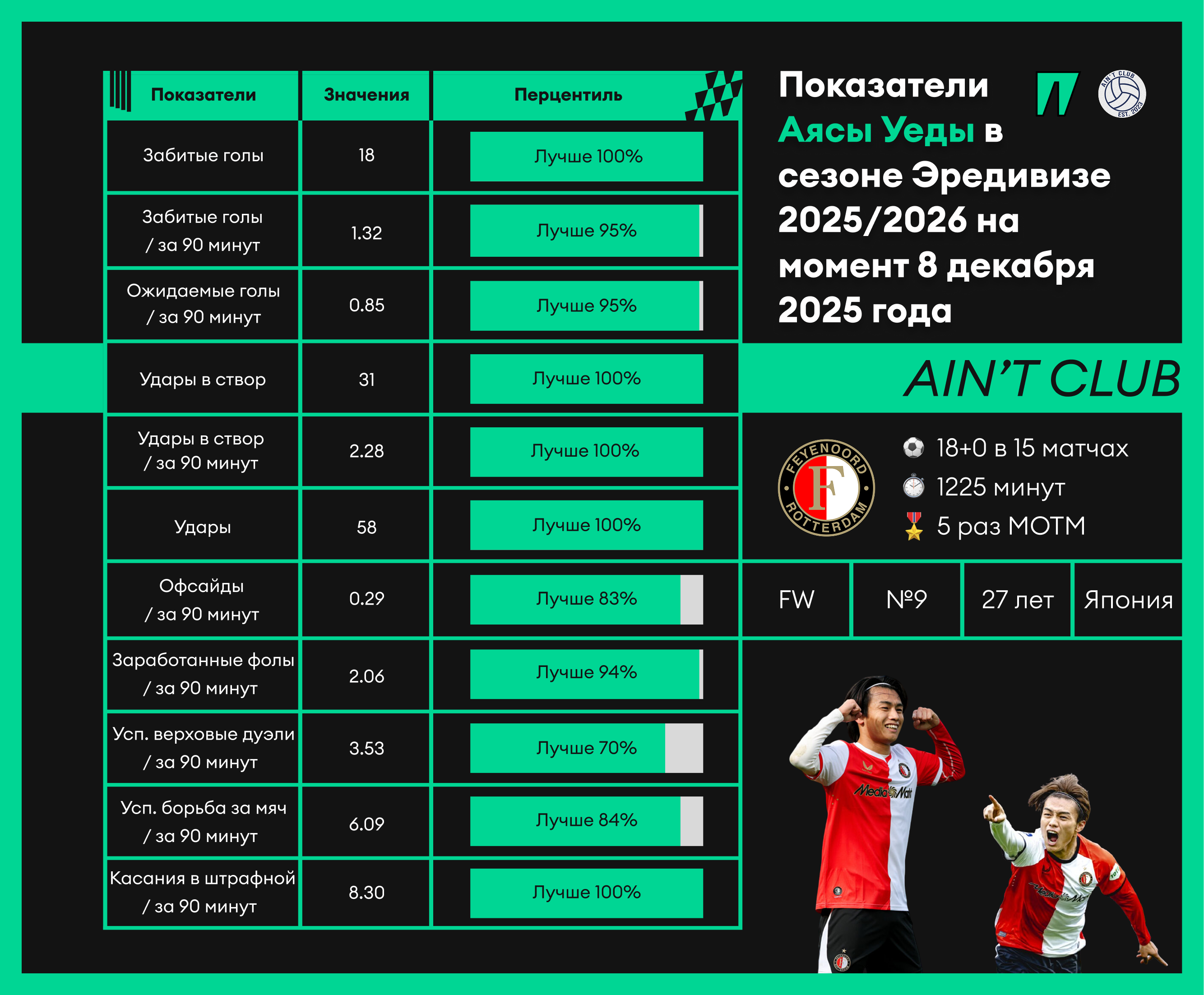 Наставничество Ван Перси и растущая уверенность все таки сделали свое дело. В сезоне 2025/26 стало ясно: при грамотном использовании Уэда — настоящий убийца в штрафной.