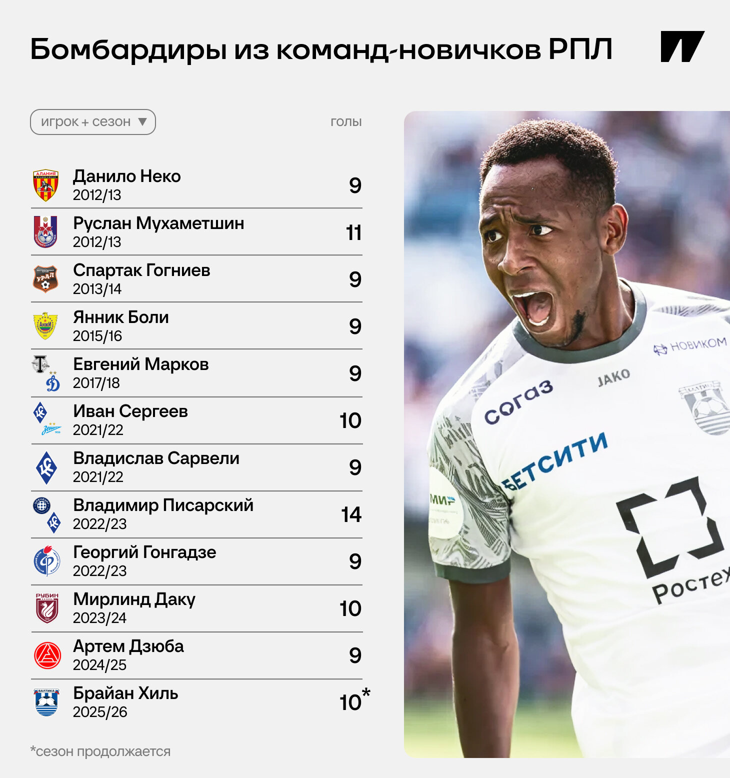 Внезапный прорыв «Балтики» принес внезапного бомбардира Мир РПЛ. У Брайана Хиля уже 10 голов – впереди только Алексей Батраков. Для игрока из команды-новичка такой темп – редкость. Хотя… стоит проверить, насколько это действительно необычно.