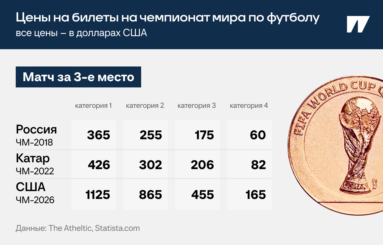 ● Матч за бронзовые медали выйдет ожидаемо дешевле, чем игры двух предыдущих стадий, но все равно слишком дорого по сравнению с прошлыми двумя турнирами. Снова самый дорогой билет на них недотягивает до самого дешевого сейчас, если не учитывать четвертую категорию.