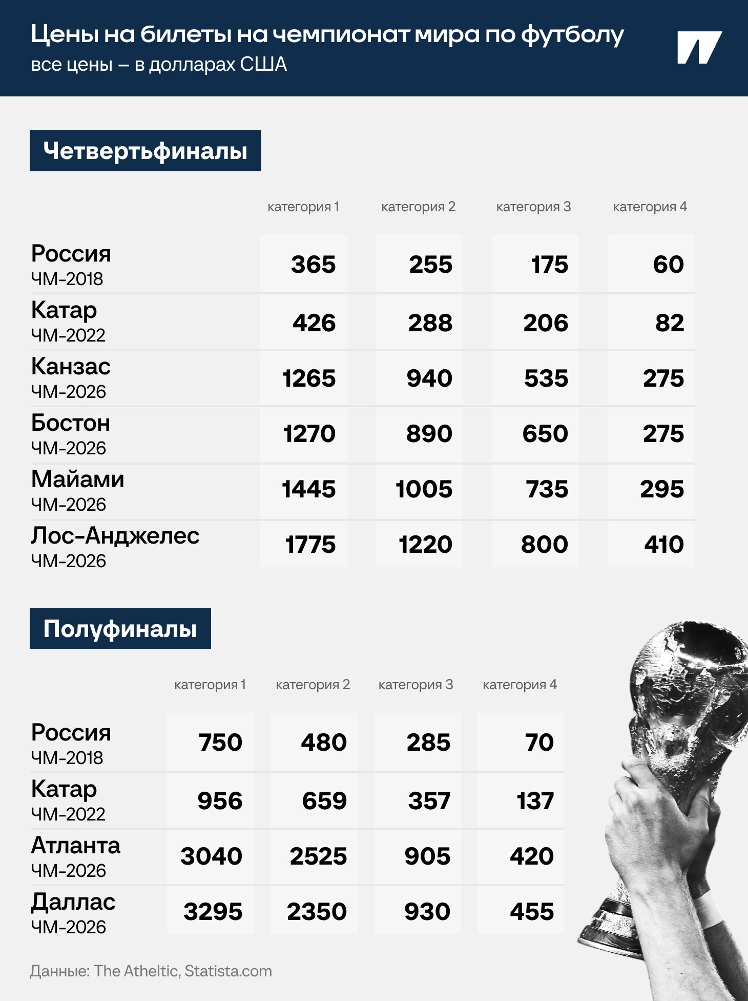 ● Ниже – сравнение четвертьфиналов. Если не брать в расчет четвертую категорию, то самый дешевый билет (на игру в Канзасе) превышает по цене самый дорогой на ЧМ-2018/2022.