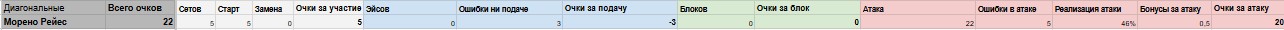 - очки за атаку: 1 балл за результативную атаку, -0,5 балла за ошибку в атаке + бонусы за стабильную реализацию атаки от 10 атак за матч: 0,5 балла за 40%+ реализации атак, 1 балл за 50%+ реализации атак, 1,5 балла за 60%+ реализации атак. Бонусный процент за реализацию немного снижен: диагональные часто атакуют неудобные мячи. Кроме того исходил из позиции, что при прочих равных доигровщики часто будут набирать больше очков, чем диагонали из-за нескольких баллов при стабильно приёме. Но это не всегда показатель того, что доигровщик провёл матч лучше.