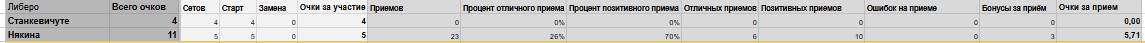 - очки за участие: за каждый сет — 1 балл. Из-за отличной от других позиций смены у либеро каждое появление в сете будет награждаться 1 баллом