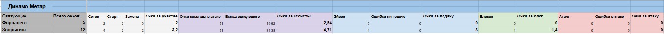 - очки за ассисты: оцениваем через формулу «вклад связующего умножить на 0,15». Вклад связующего оцениваем по формуле «набранные очки команды в атаке умножить на (очки за участие связующего A / (суммарное количество очков за участие всех связующих)). Я очень долго думал, как оценить вклад связующего игрока в результат команды, помимо активных действий. Так как статистика с сервиса не позволяет отслеживать передачи на атаку, то я придумал данную формулу: она приблизительно отражает вклад связующего игрока в матче. Чтобы награждать игрокам одним фэнтези-баллом за примерно каждые 6-7 результативных атак команды, умножаем вклад на 0,15 балла.
